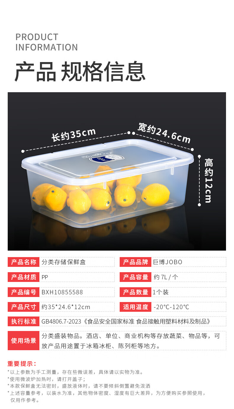 商品名称: 巨博(JOBO)塑料保鲜盒7L冰箱分类收纳盒蔬菜水果食品储物盒PP食品级 商用保鲜盒/个