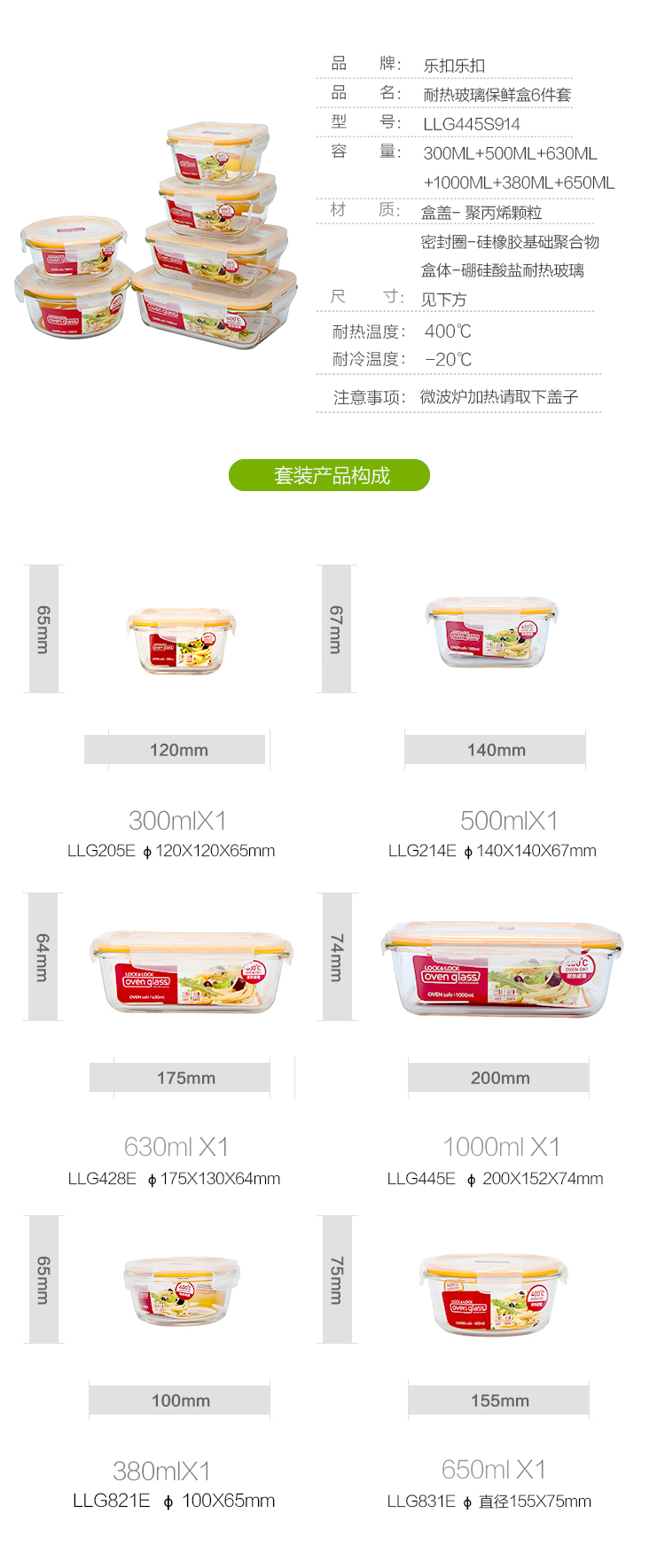 商品名称: 乐扣乐扣(LOCK&LOCK)耐热玻璃保鲜盒微波炉饭盒上班族便当盒学生水果饭菜餐盒6件套 保鲜盒/套