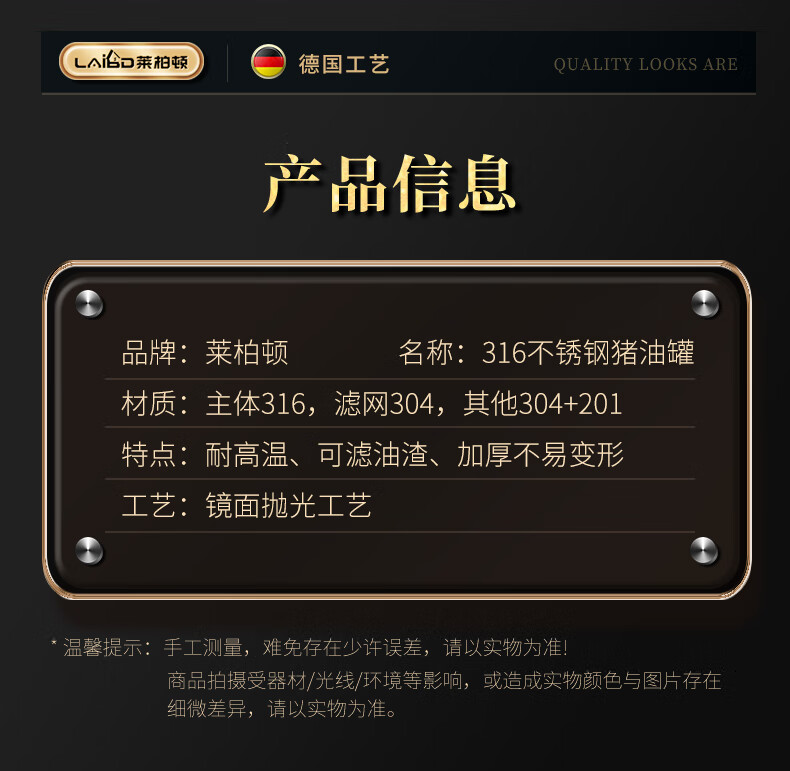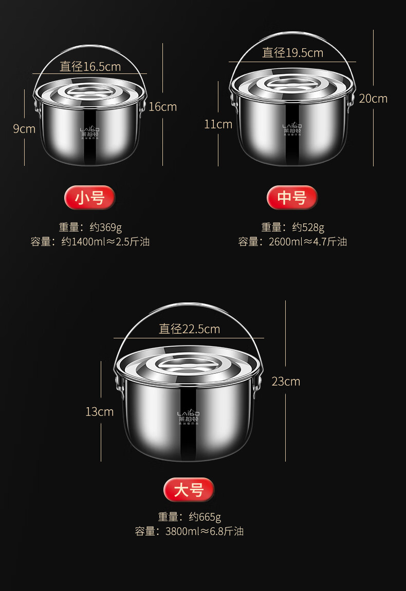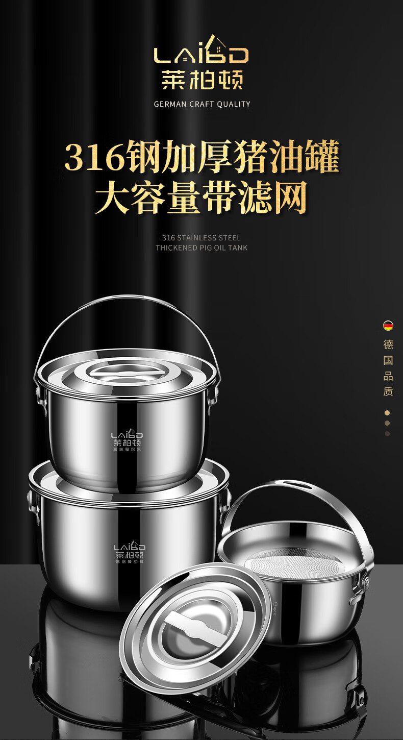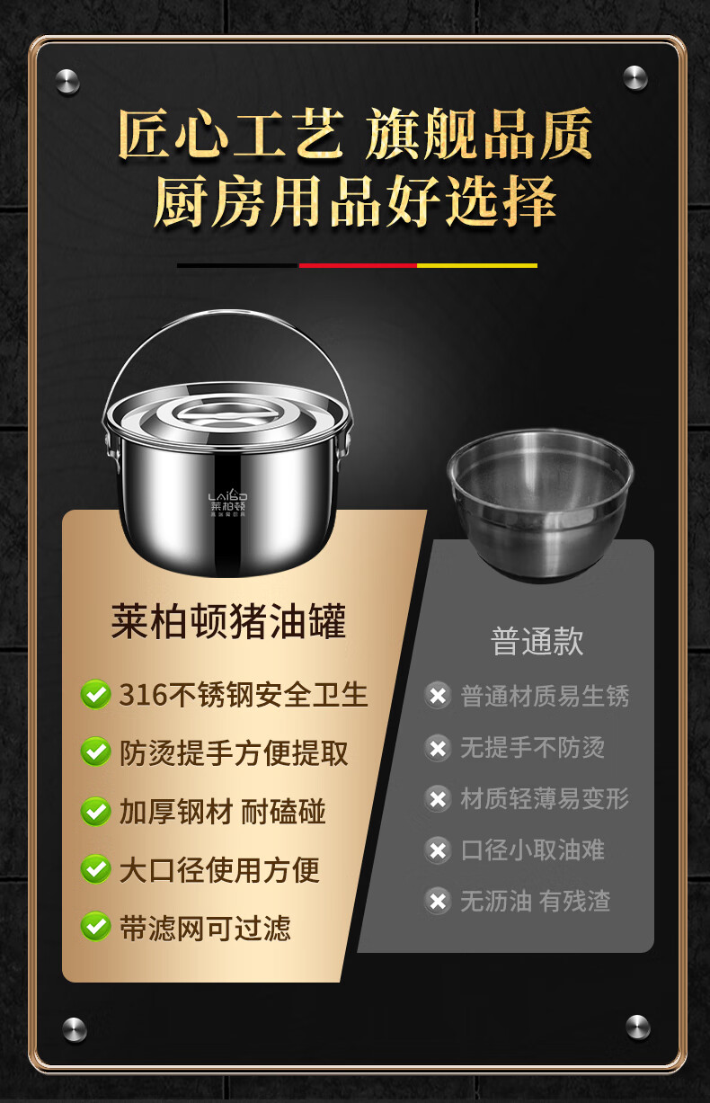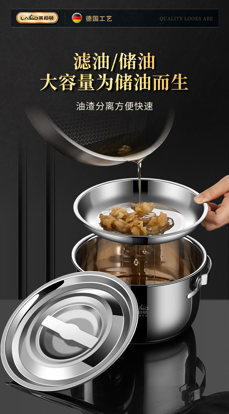 商品名称: 莱柏顿316不锈钢猪油罐大容量调味盆带盖带滤网猪油盆调味罐调料缸2.6L 316不锈钢猪油罐/个
