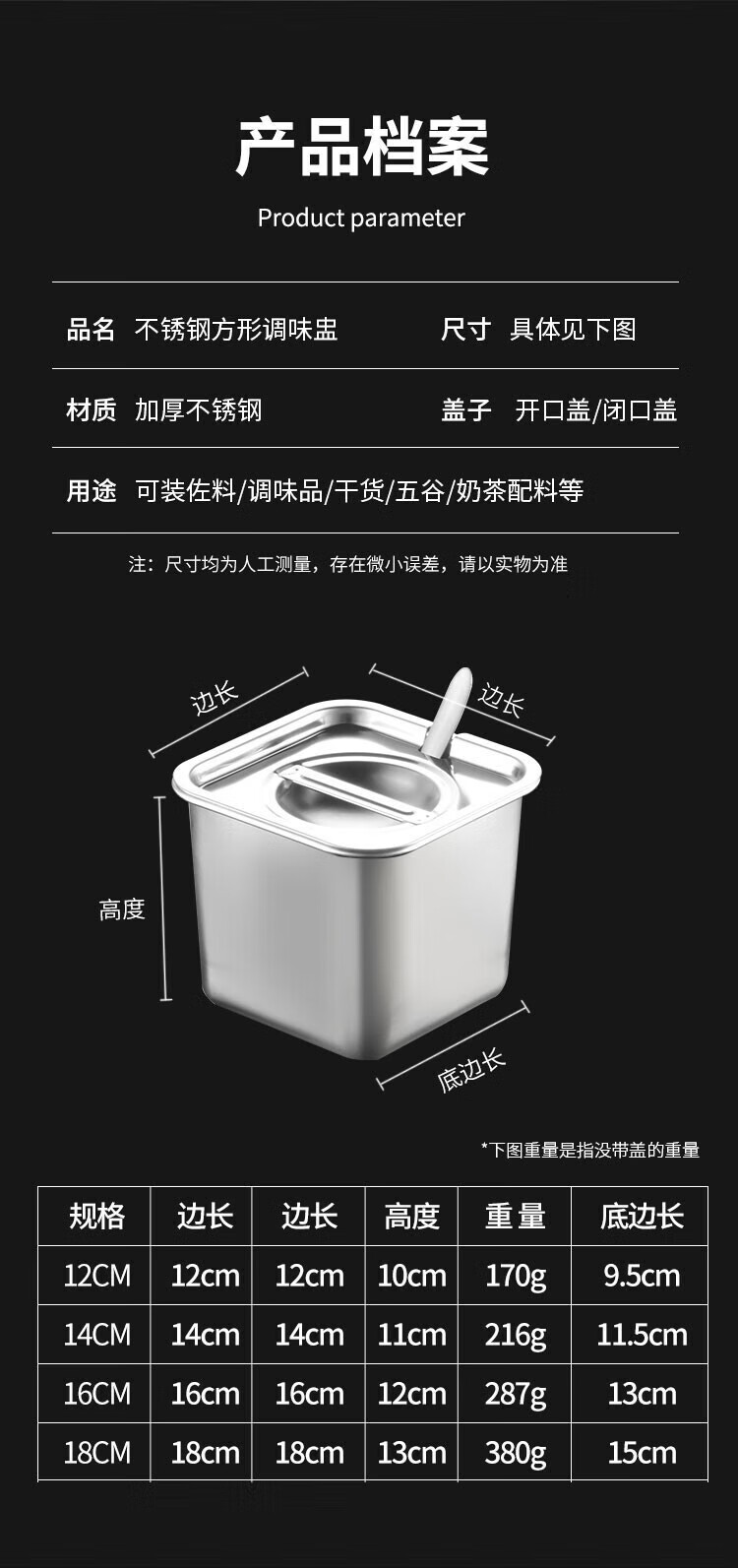商品名称: 京蓓尔 不锈钢方形调料罐味盅佐料盒调味缸 14cm方形味盅【闭口盖】 14cm方形味盅【闭口盖】/个