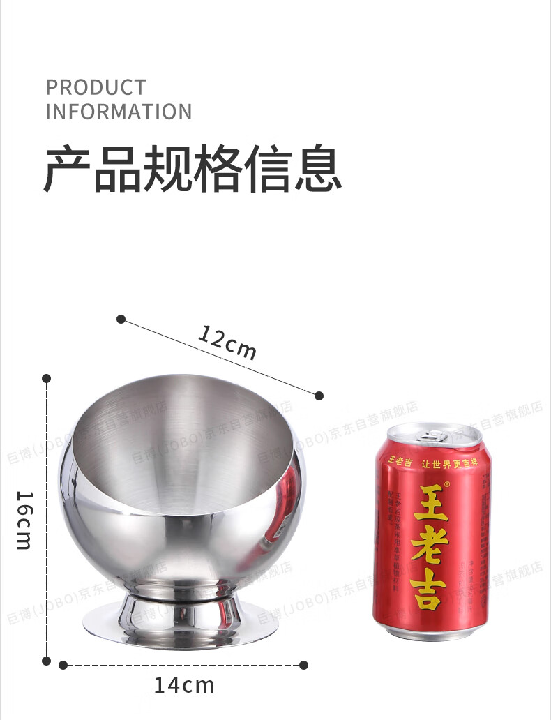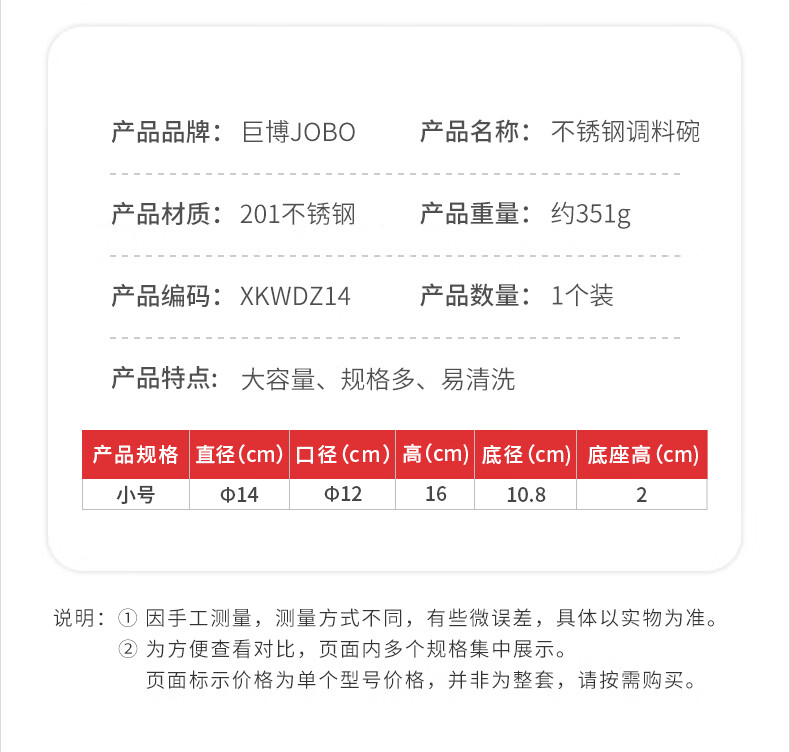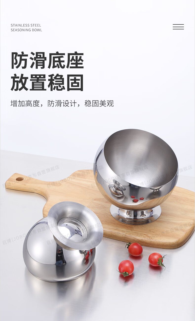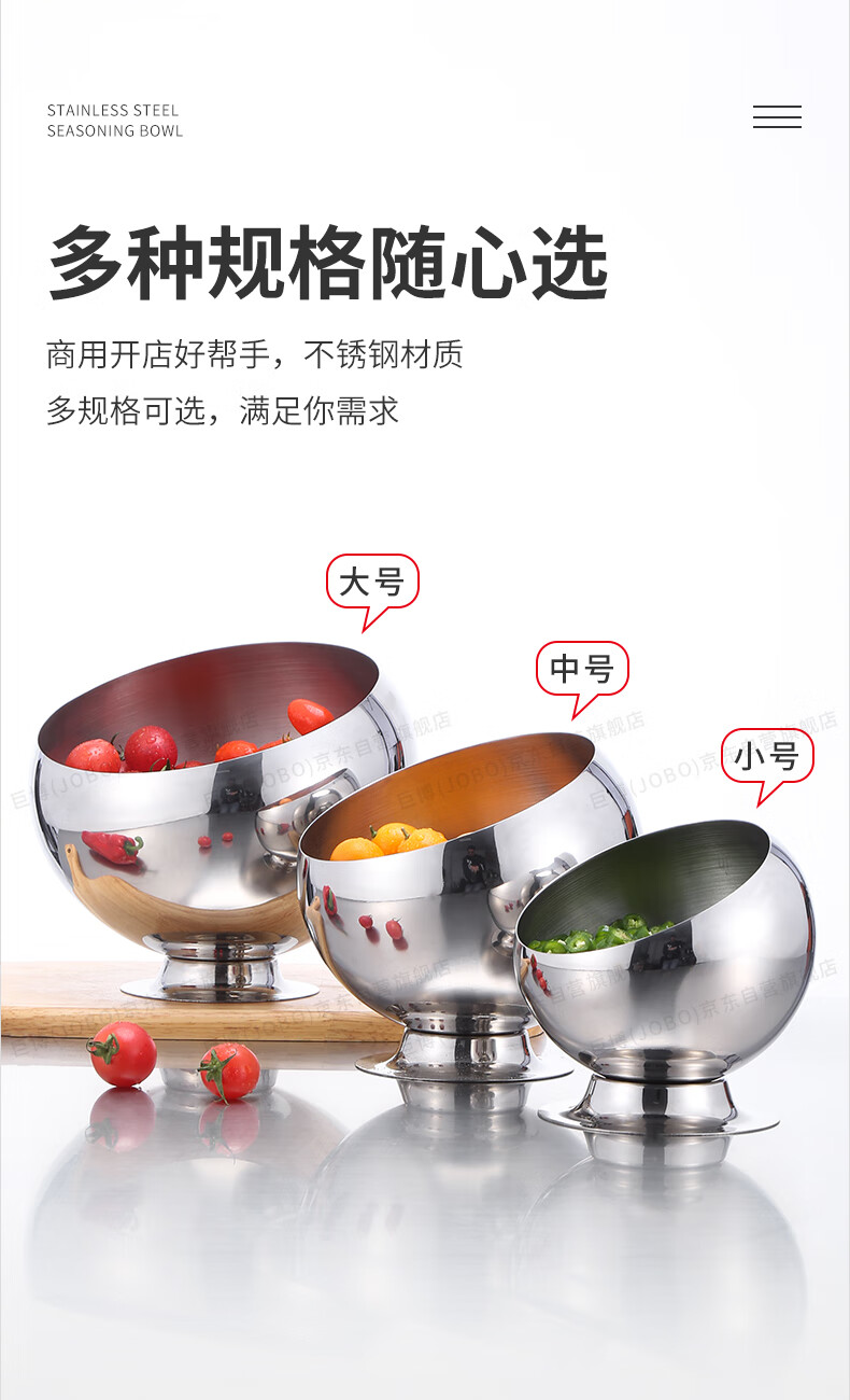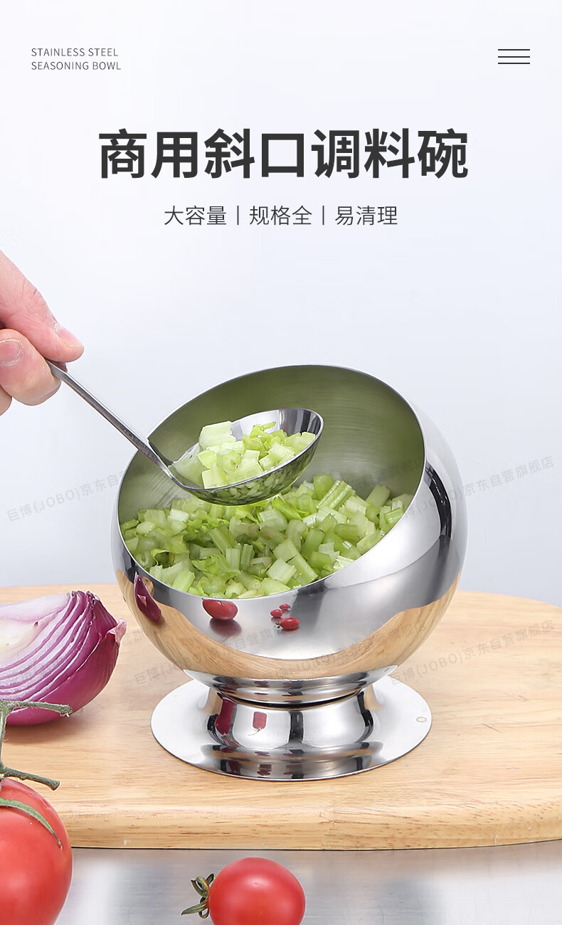 • 商品名称:巨博(JOBO)不锈钢斜口调料碗 蘸料调味罐带底座 火锅店自助餐厅推荐小号14cm 不锈钢斜口碗调料碗中号14cm带底座/个