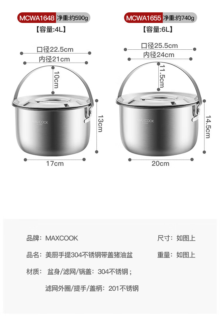 • 商品名称:美厨(maxcook)304不锈钢猪油罐调料盆 猪油盆调味罐调料缸6L带盖带网MCWA1655 304不锈钢猪油盆猪油罐/个