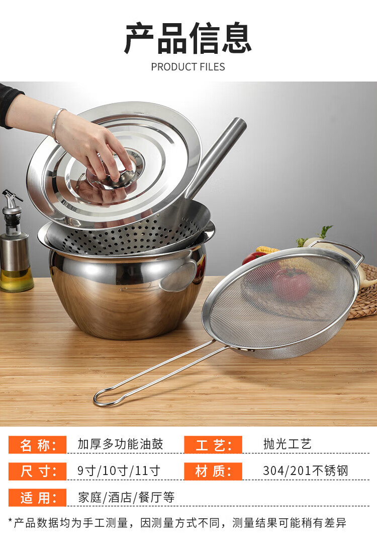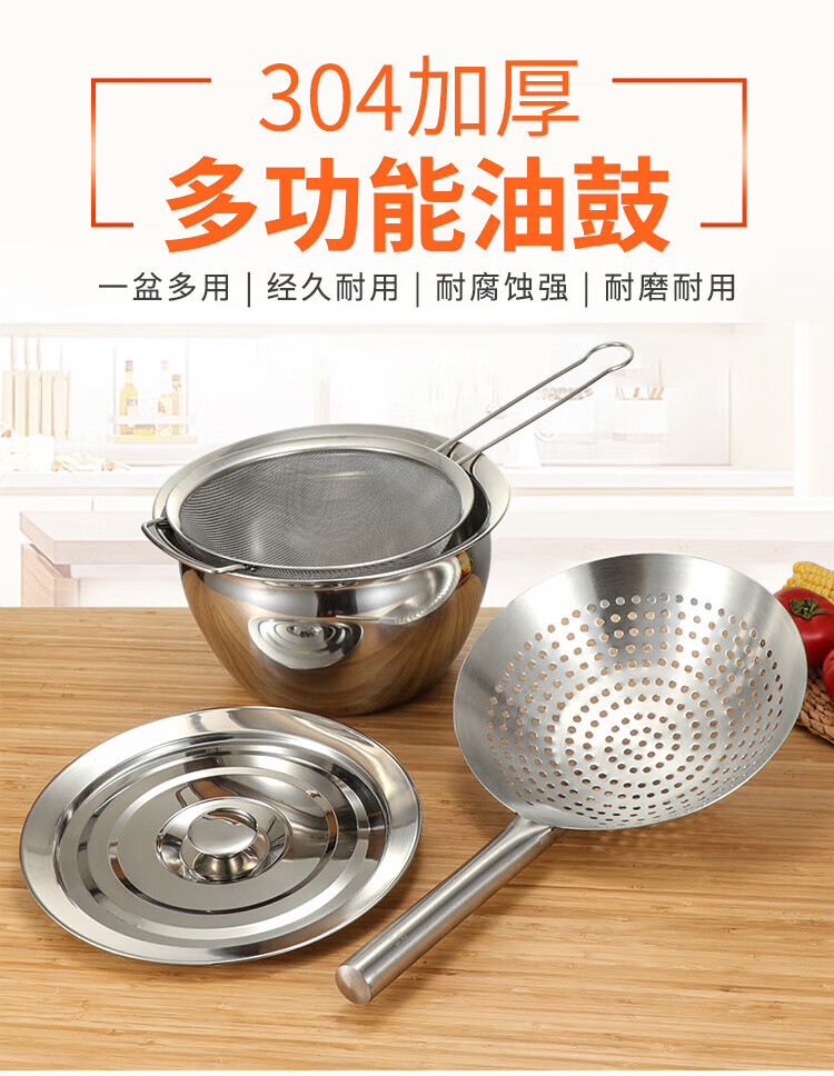 • 商品名称:丹诗致远 不锈钢油盆油缸油鼓油罐油盆套装 304 11英寸油鼓+漏勺+盖子 11英寸油鼓+漏勺+盖子/个
