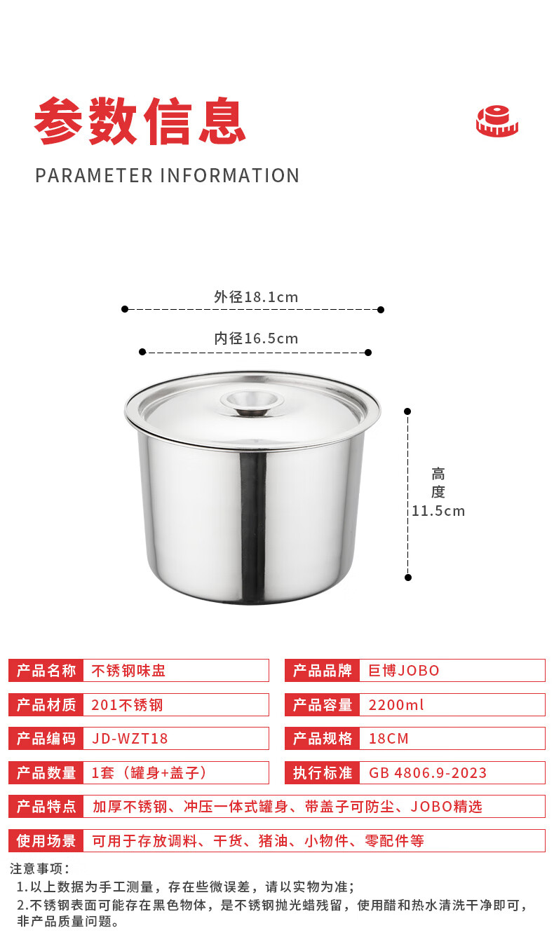 • 商品名称:巨博(JOBO)商用不锈钢味盅调味缸罐带盖子18cm 酒店餐饮调料缸猪油罐佐料 商用不锈钢味盅18cm/个