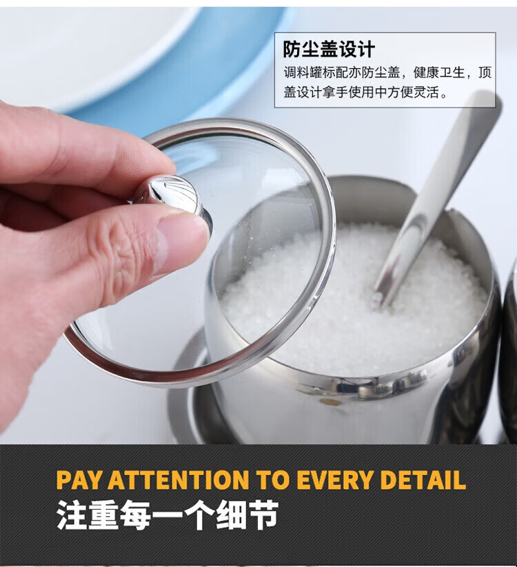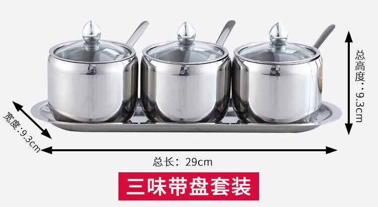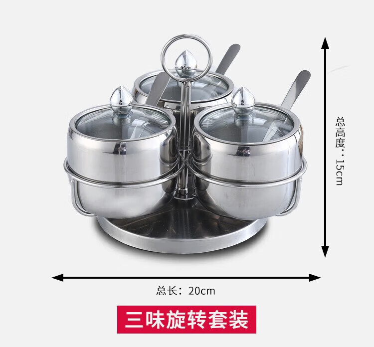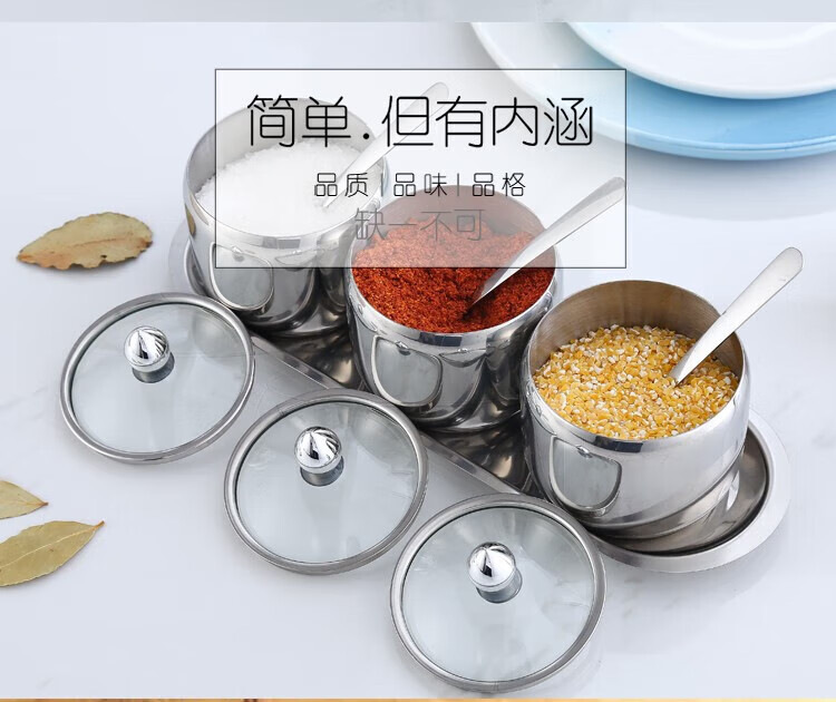 商品名称: 丹诗致远 304不锈钢调料罐辣椒罐味精盐罐可定制 三味旋转【玻璃盖套装】 三味旋转【玻璃盖套装】/次