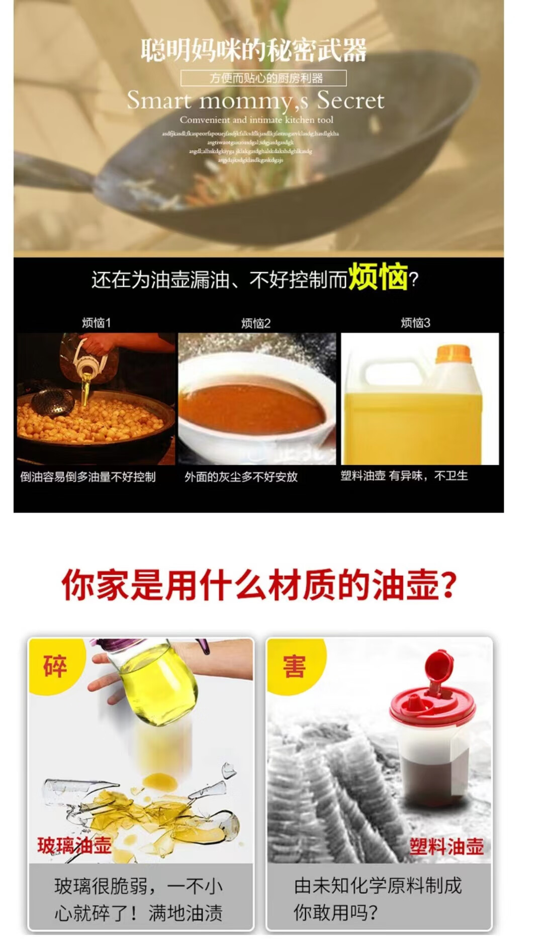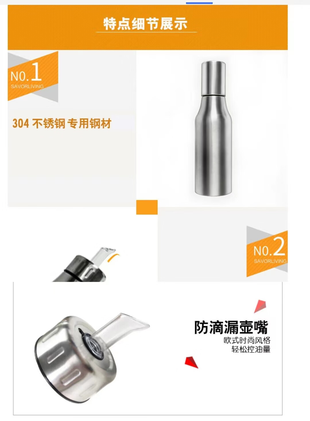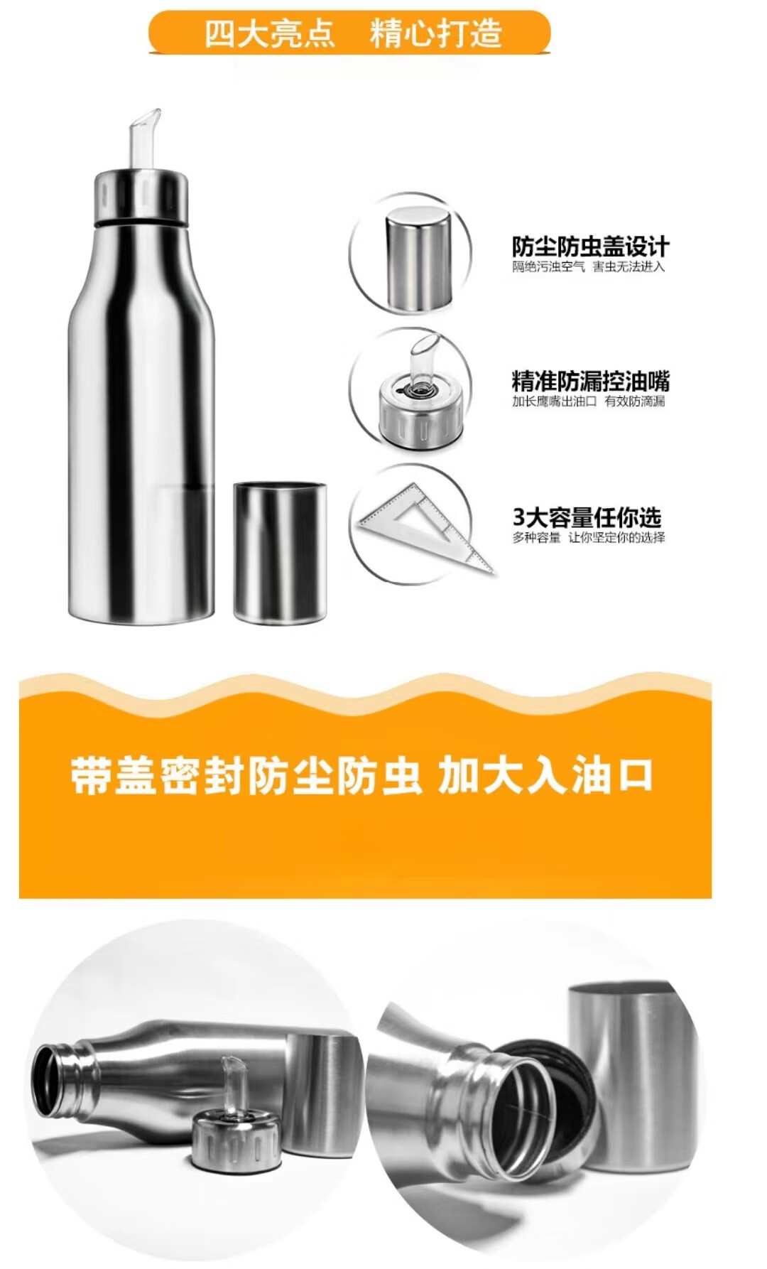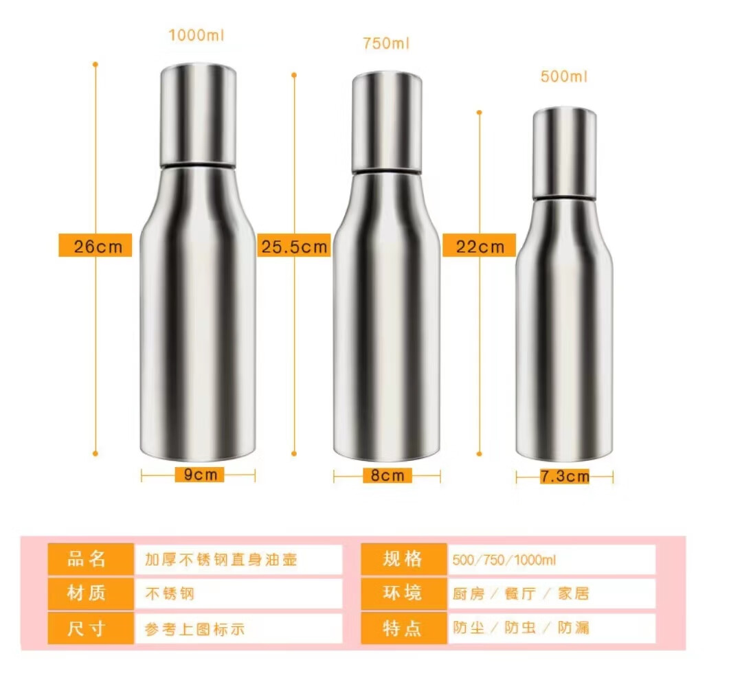 商品名称: 麦朗 304不锈钢油壶 防尘防漏食用油瓶 酱醋带盖调味罐 1000ml 单个装 100ml/个