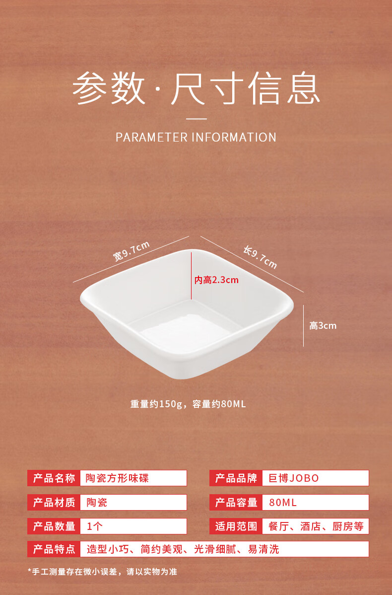 • 商品名称:巨博(JOBO)陶瓷味碟小碟子 调料碟沾碟早餐碟 醋碟1个装 30个起售 陶瓷味碟小碟子/个