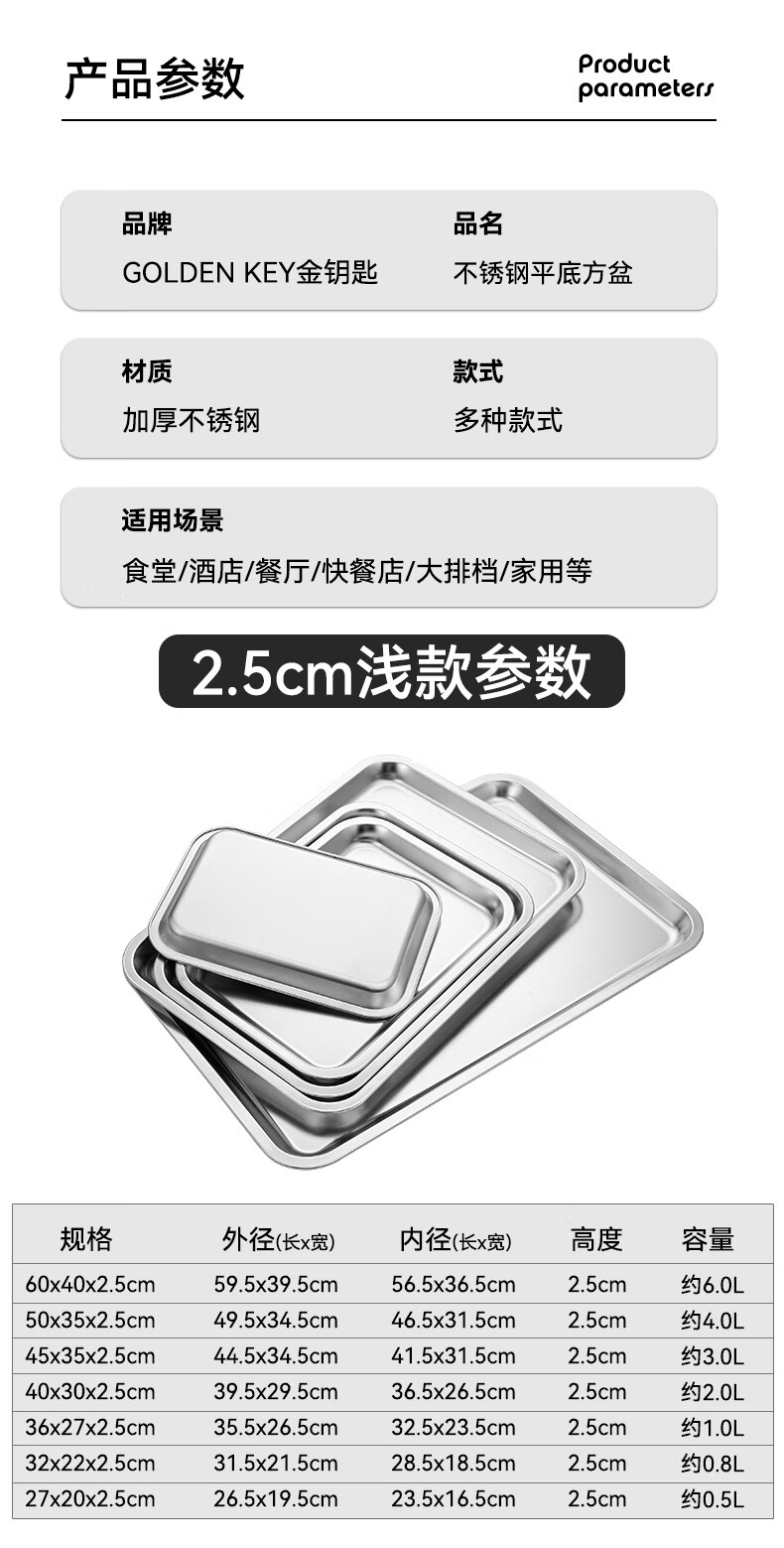 • 商品名称:金钥匙(GOLDEN KEY)不锈钢平底浅方盆长方形托盘蒸饭盘菜盘饺子盘水果盘GK-FP6040-25 不锈钢浅方盆/个