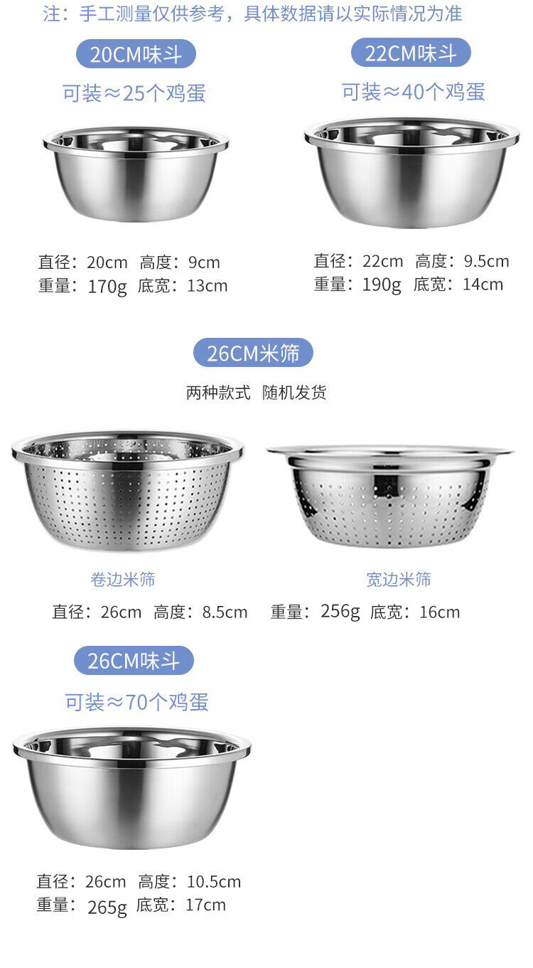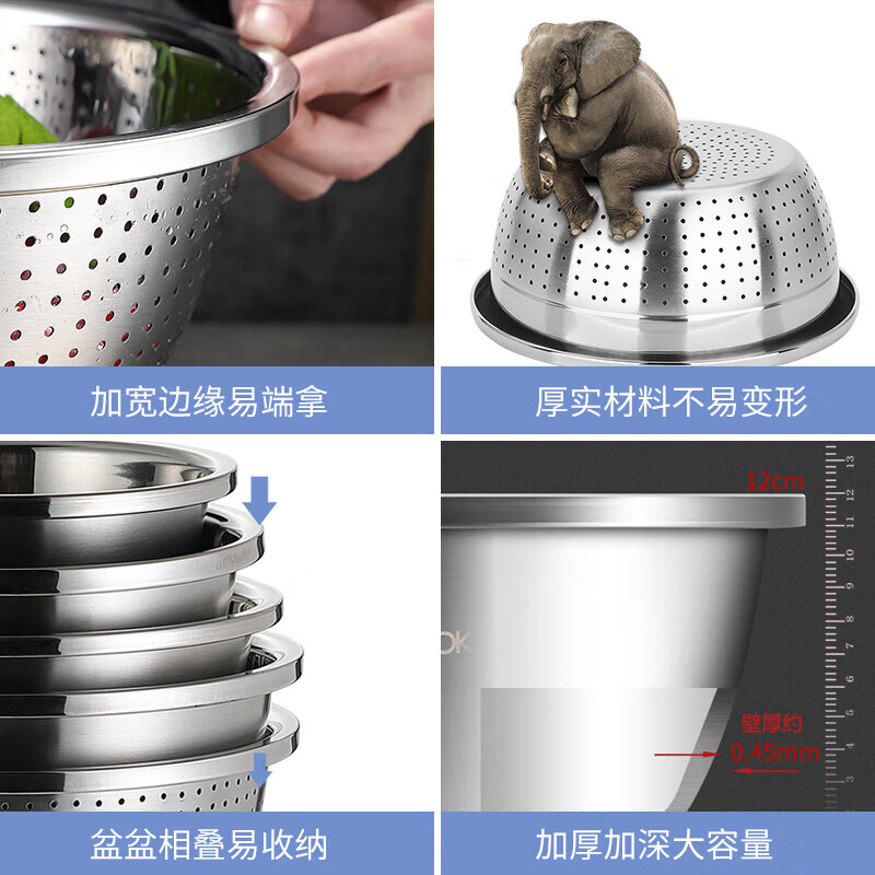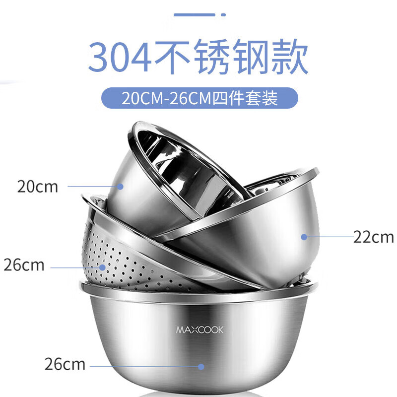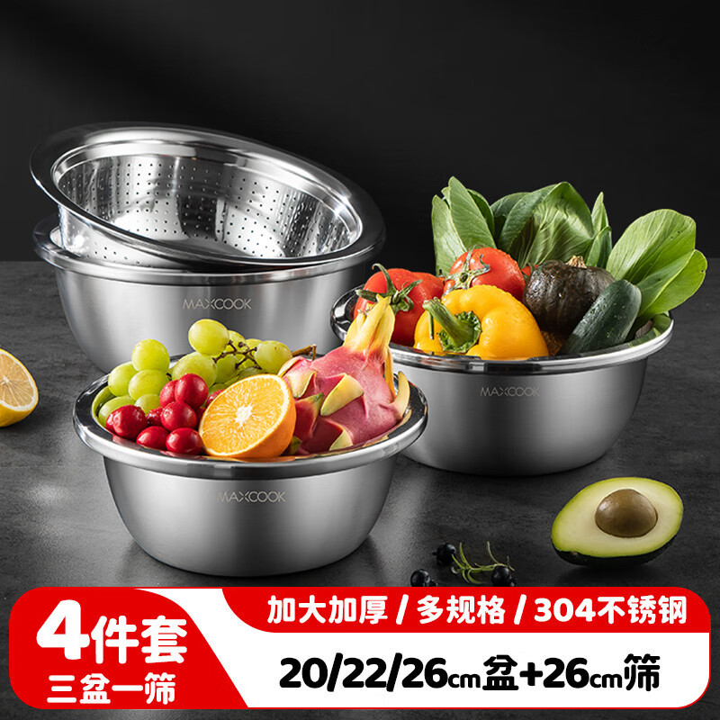 厨具  > 厨房储物  > 料理盆  >  美厨/maxcook  >  美厨(maxcook)304不锈钢盆筛四件套 加大加厚调料盆洗菜盆 米筛味斗套装MCWA559 304不锈钢盆沥水篮/只