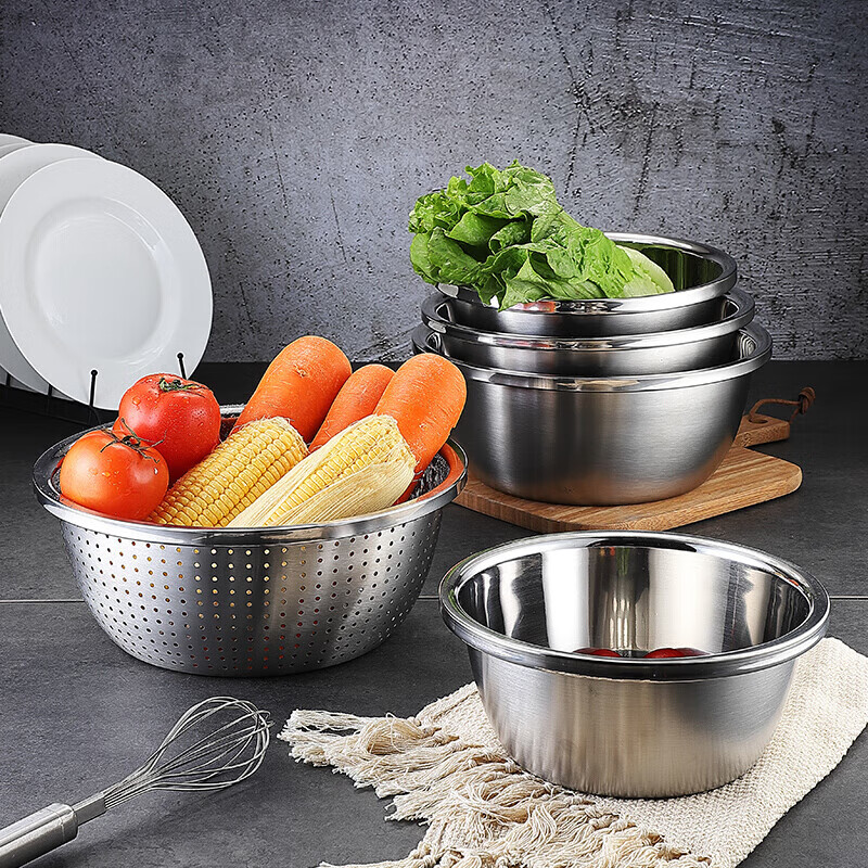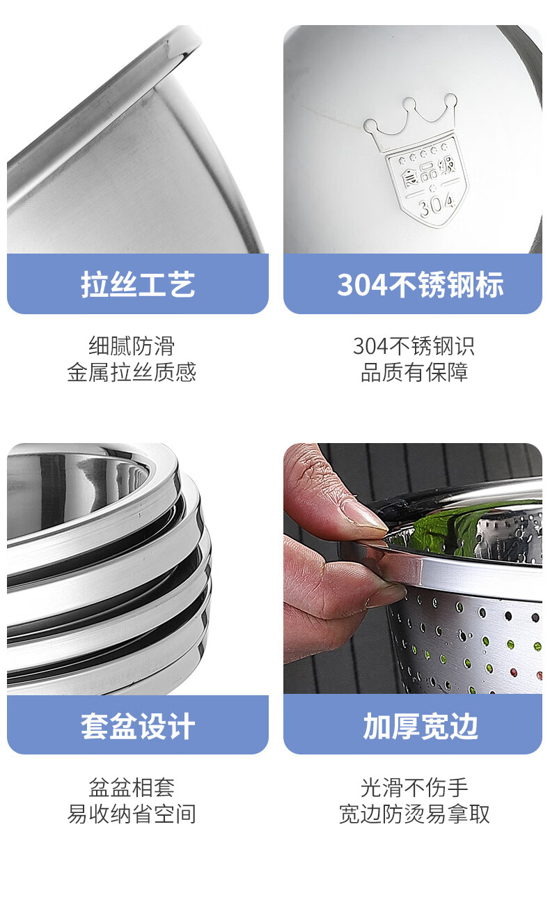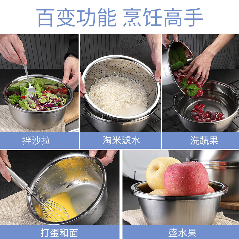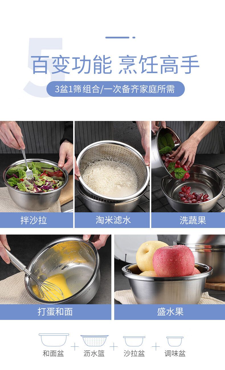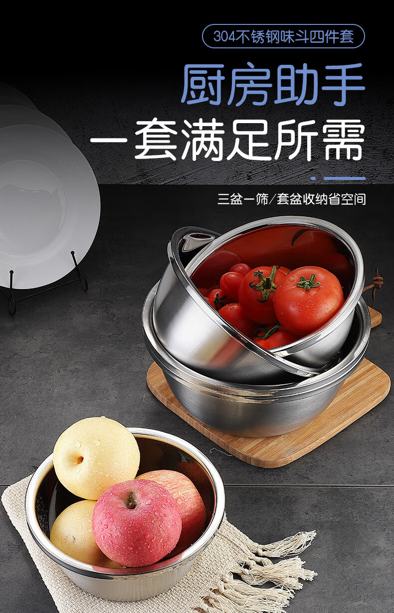 • 商品名称:美厨(maxcook)304不锈钢盆筛四件套 加大加厚调料盆洗菜盆 米筛味斗套装MCWA559 304不锈钢盆沥水篮/只