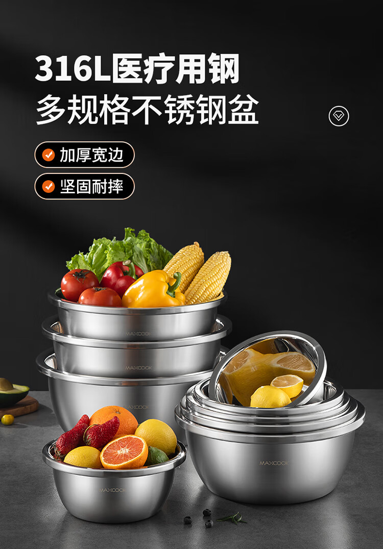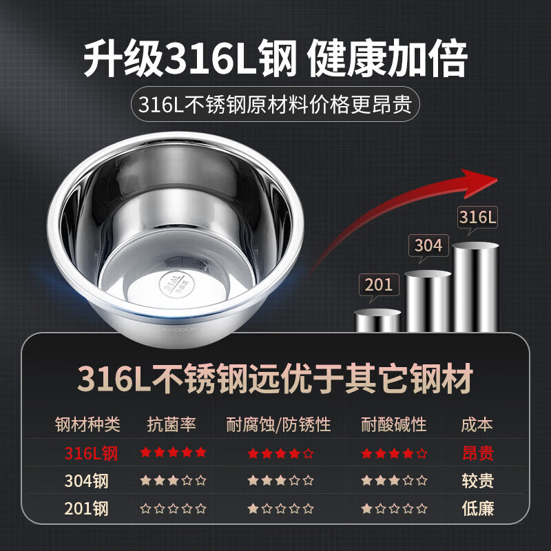 • 商品名称:美厨(maxcook)316L不锈钢盆调料盆 加厚味斗20CM 洗菜盆沙拉盆和面盆MCWA1816 316L不锈钢调料盆/个
