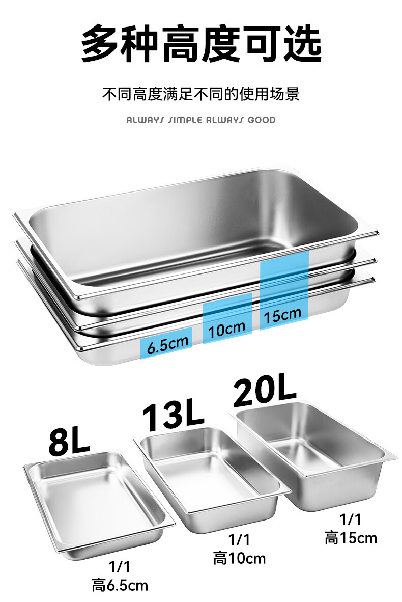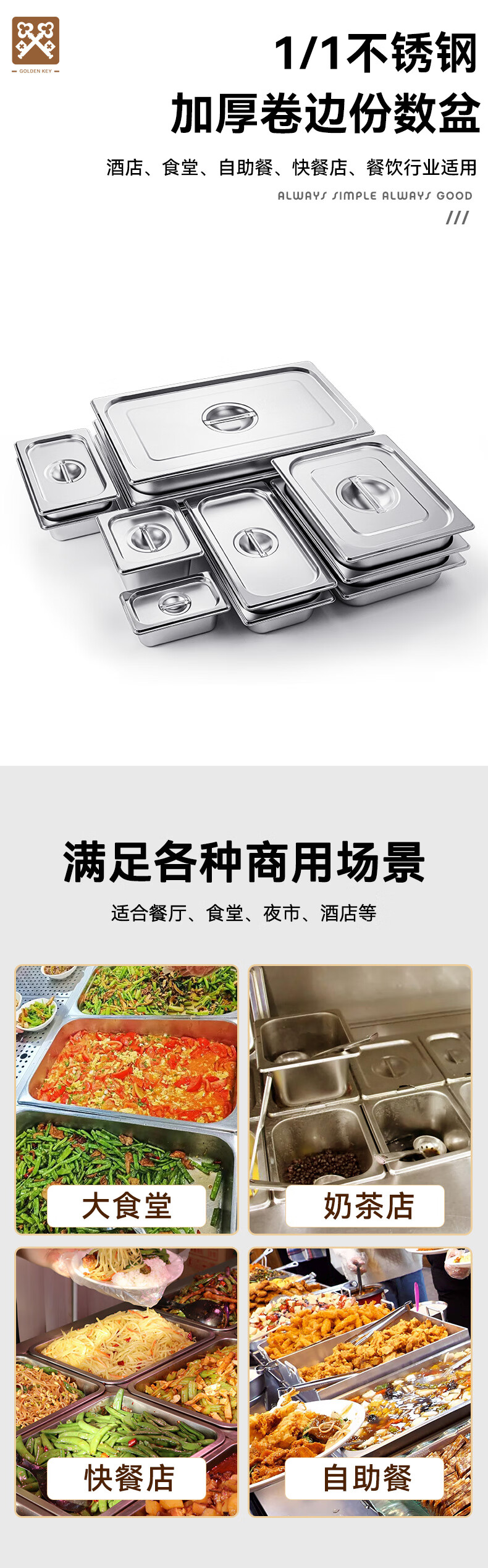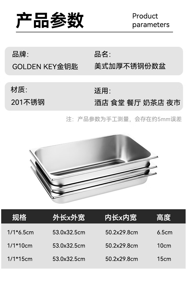 • 商品名称:金钥匙(GOLDEN KEY)不锈钢份数盆1/1直身卷边食堂打菜商用10cm餐盆GK-MFS11-100 不锈钢份数盆/个