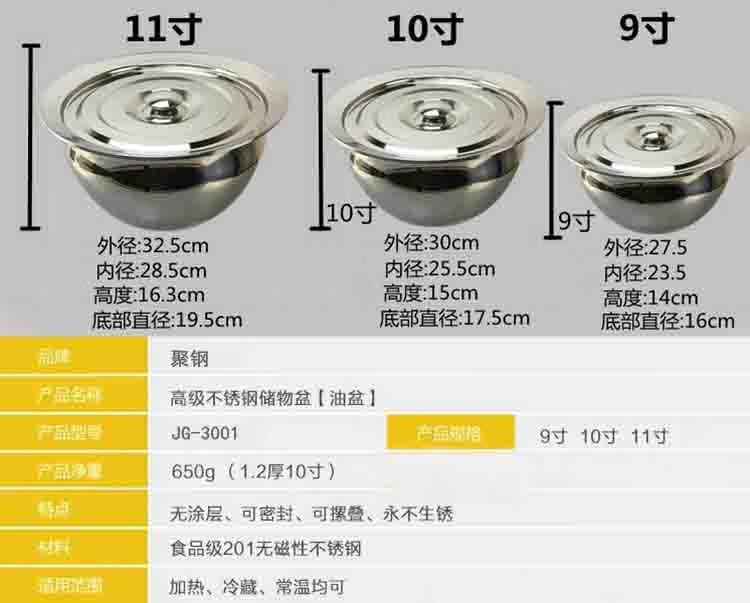 • 商品名称:今万福 不锈钢油鼓盆 加厚不锈钢无磁涨形油鼓盆厨房用品 加厚11寸油盆 油盆/个