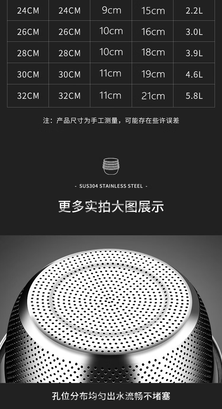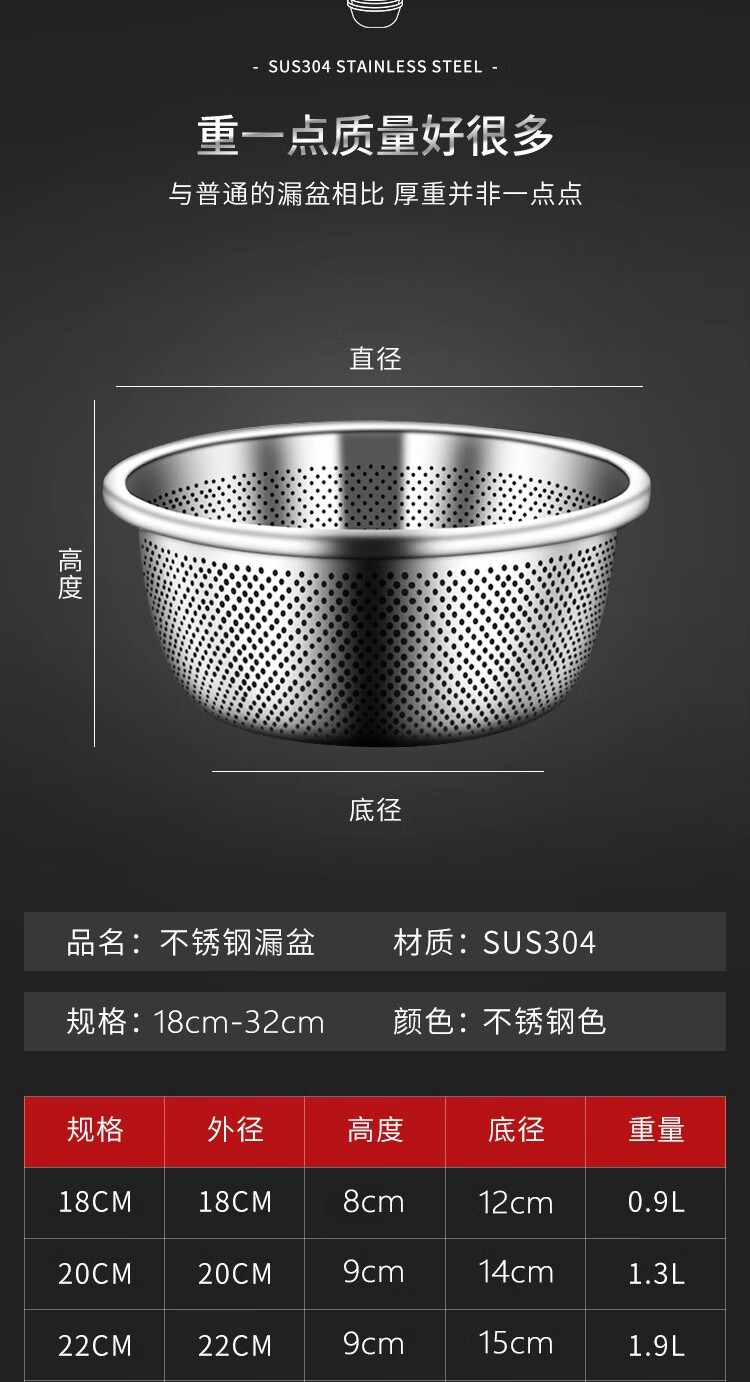 商品名称: 膳于福304不锈钢沥水篮洗菜盆洗米筛厨房神器水果篮漏盆淘米盆SYF-1013 SYF-1013/个