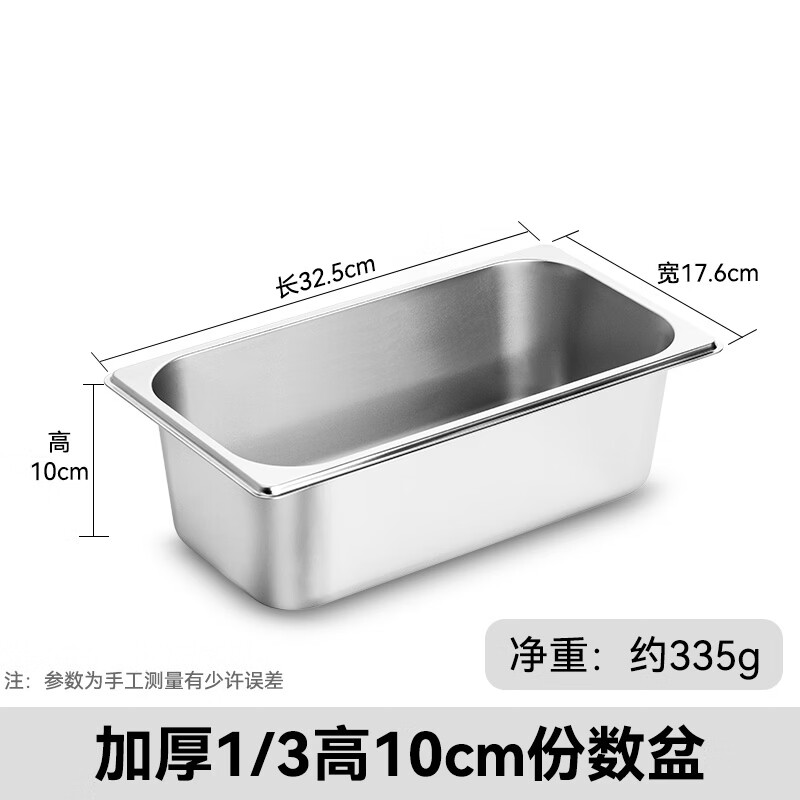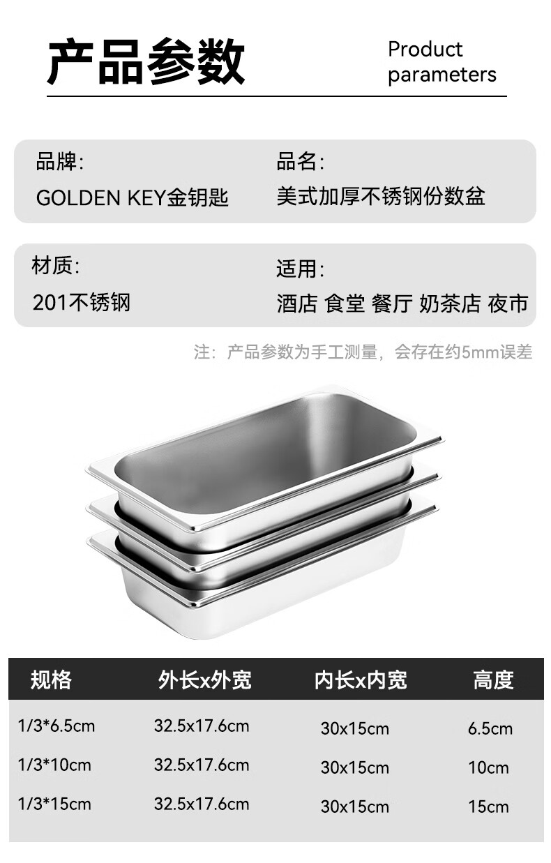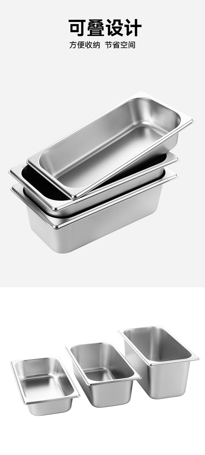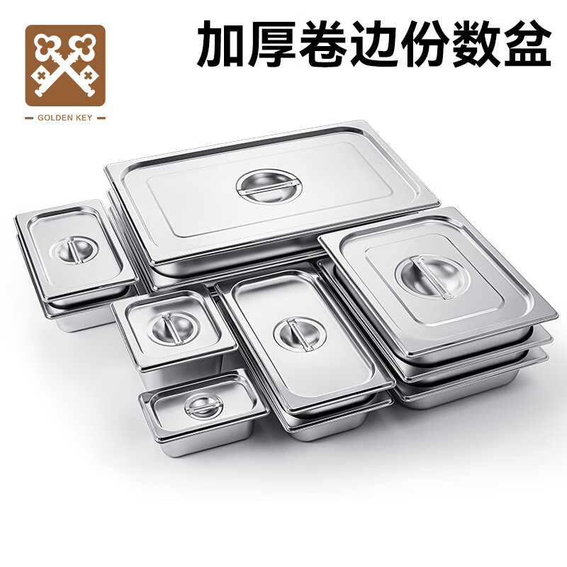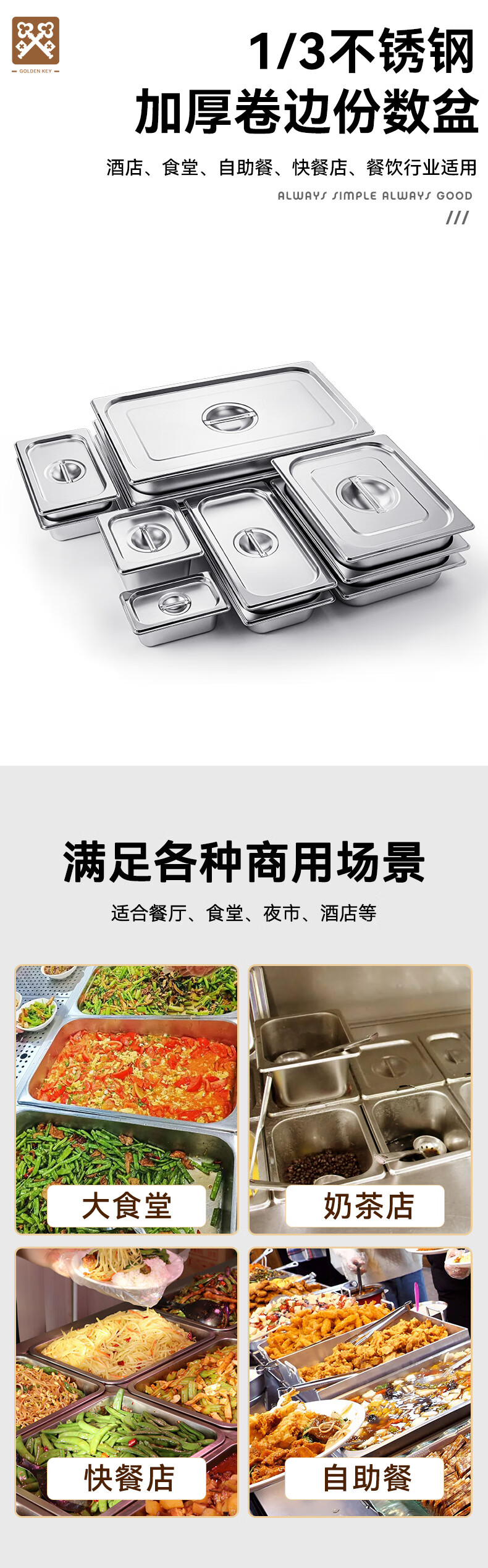 • 商品名称:金钥匙不锈钢份数盆1/3直身卷边自助餐商用食堂打菜盆10cmGK-MFS13-100 不锈钢份数盆/个