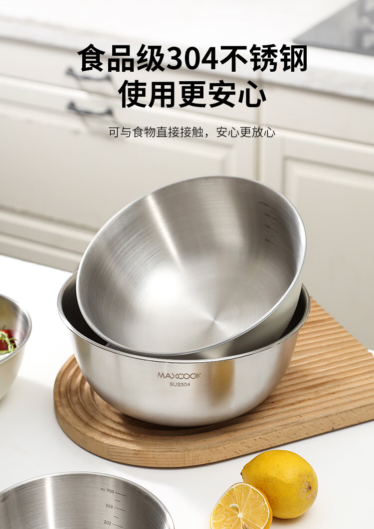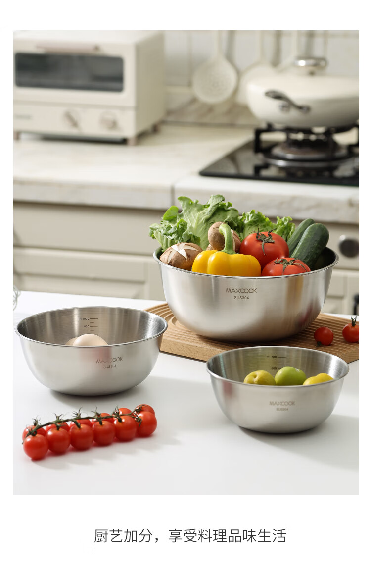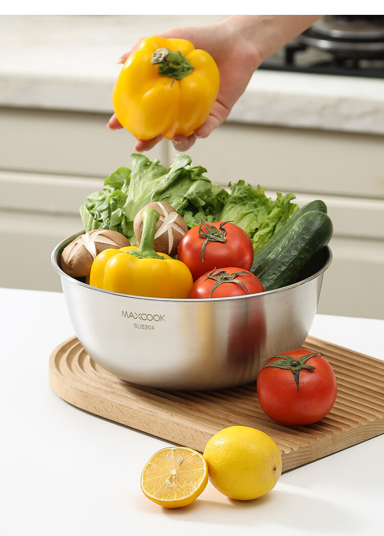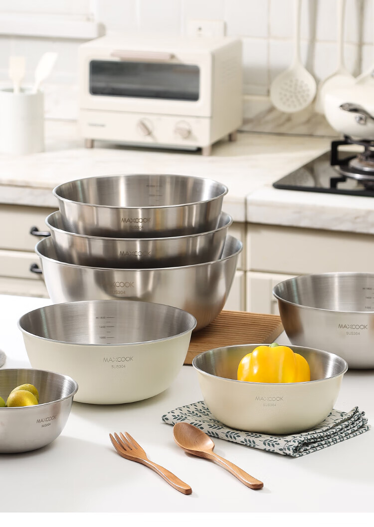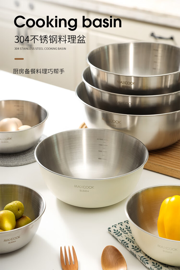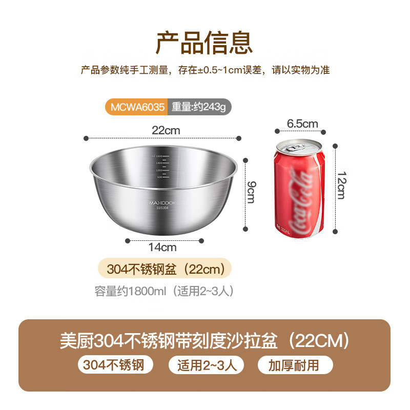 厨具  > 厨房储物  > 料理盆  >  美厨/maxcook  >  美厨(maxcook)304不锈钢盆沙拉盆加厚调料盆洗菜盆和面盆带刻度22cm 个MCWA6035 304不锈钢盆沙拉盆/个