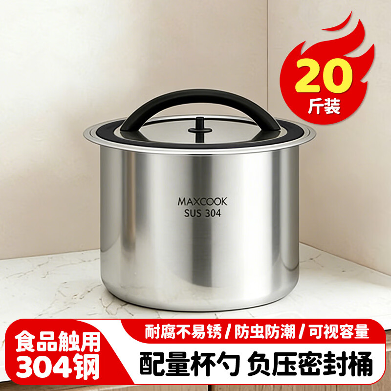 美厨(maxcook)米桶米箱储存罐 304不锈钢杂粮密封储物桶装米米缸10KG MCX5813 304不锈钢米桶储物桶/个