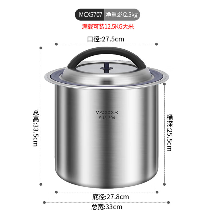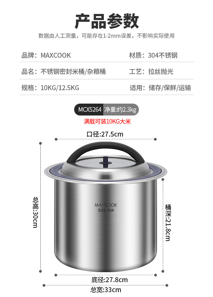商品名称: 美厨(maxcook)米桶米箱储存罐 304不锈钢杂粮密封储物桶装米米缸10KG MCX5813 304不锈钢米桶储物桶/个