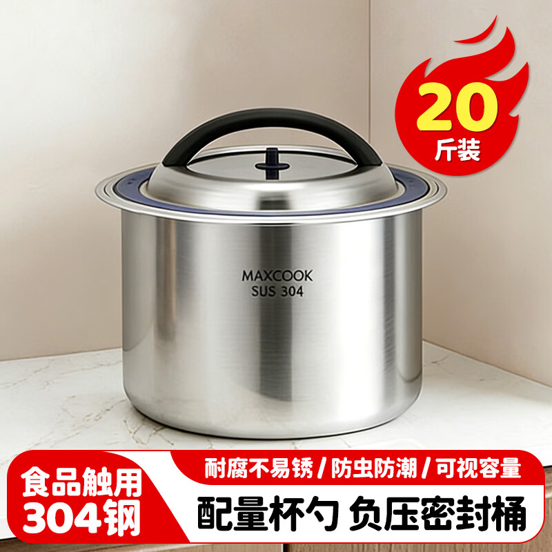 美厨(maxcook)米桶米箱储存罐 304不锈钢杂粮密封储物桶装米米缸10KG MCX5264 304不锈钢密封米桶储物桶/个