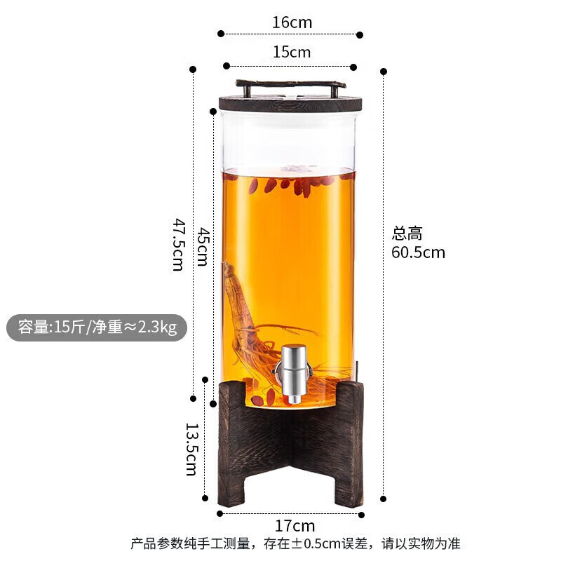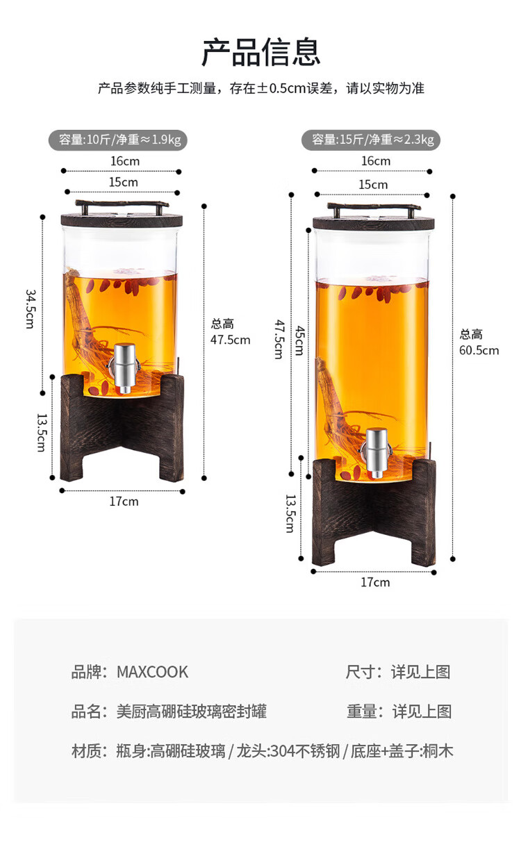• 商品名称:美厨(maxcook)泡酒瓶泡酒坛 酿酒密封药酒罐高硼硅玻璃酒桶带底座15斤装MCX7119 泡酒瓶泡酒坛/个