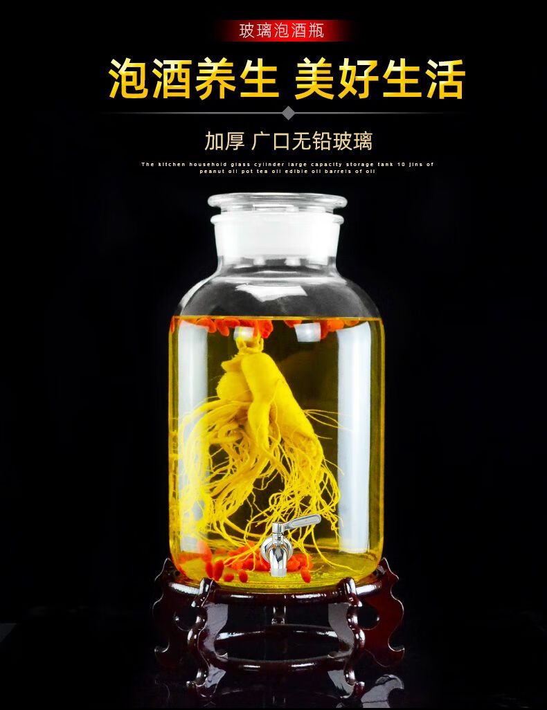 商品名称: 尼尔欣泡酒玻璃瓶带龙头3斤5斤10斤20密封泡酒罐家用酒坛子专用酒 5斤+木底座 送酒提/个
