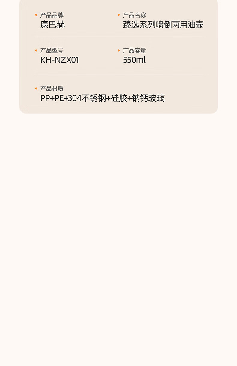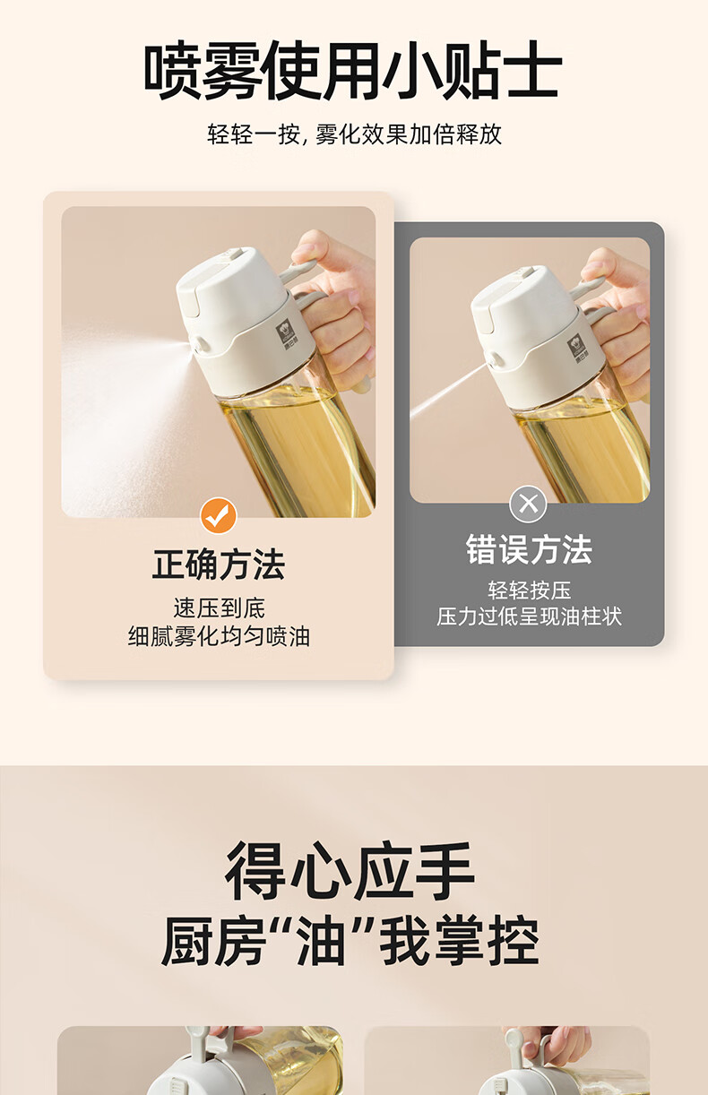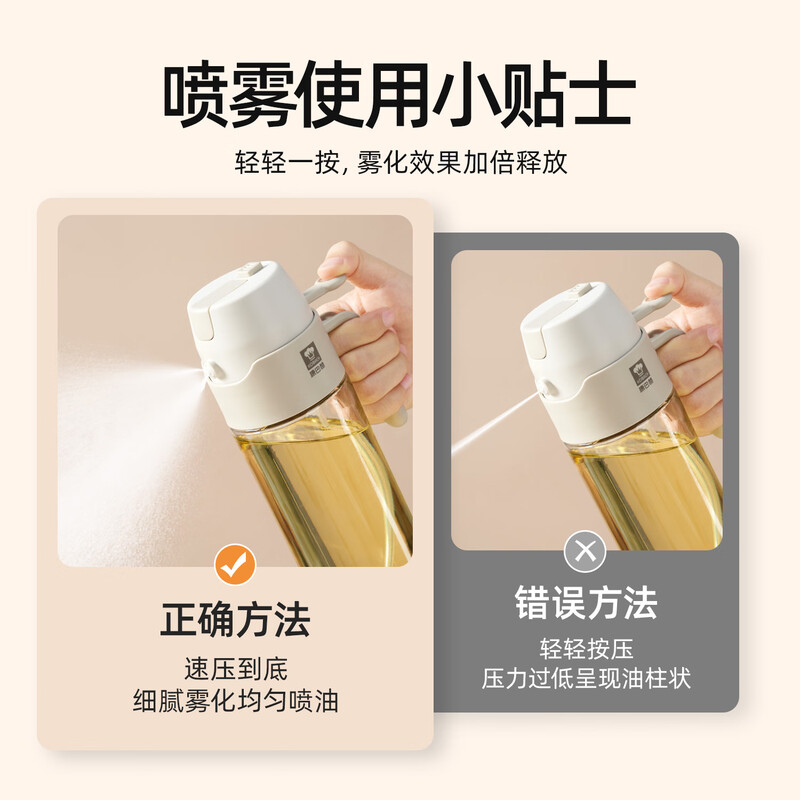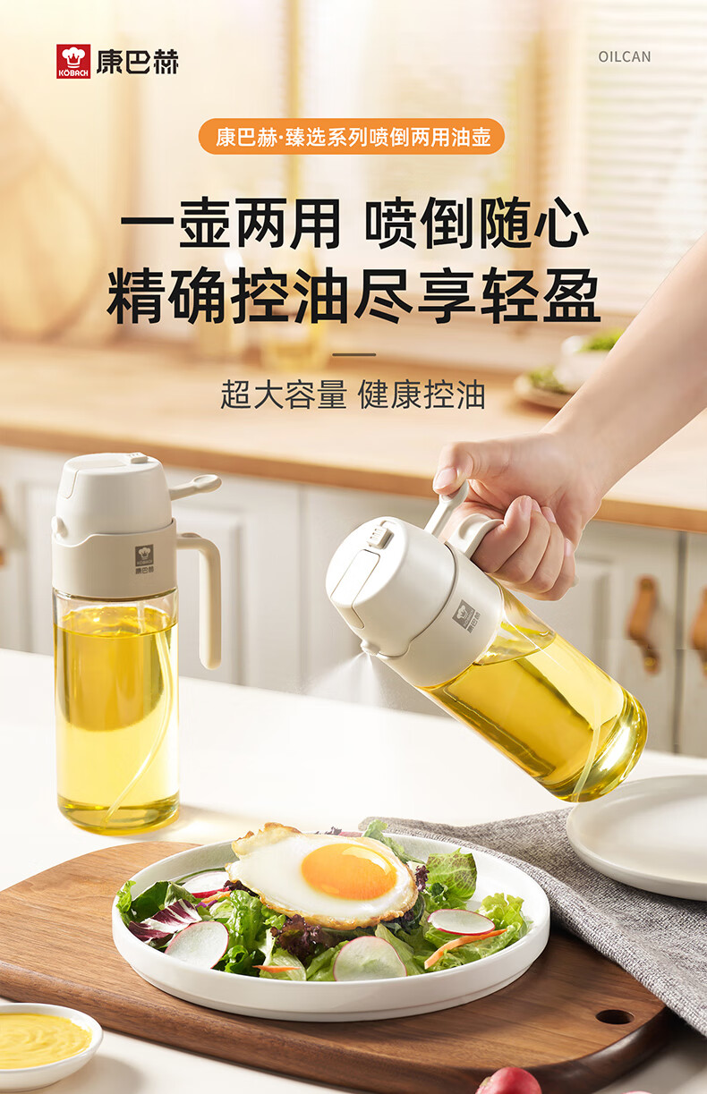 厨具  > 厨房储物  > 油壶  >  康巴赫/KBH  >  康巴赫喷油壶家用厨房不挂油喷倒两用防漏油罐玻璃喷雾油壶调料瓶550ML KH-NZX01/个