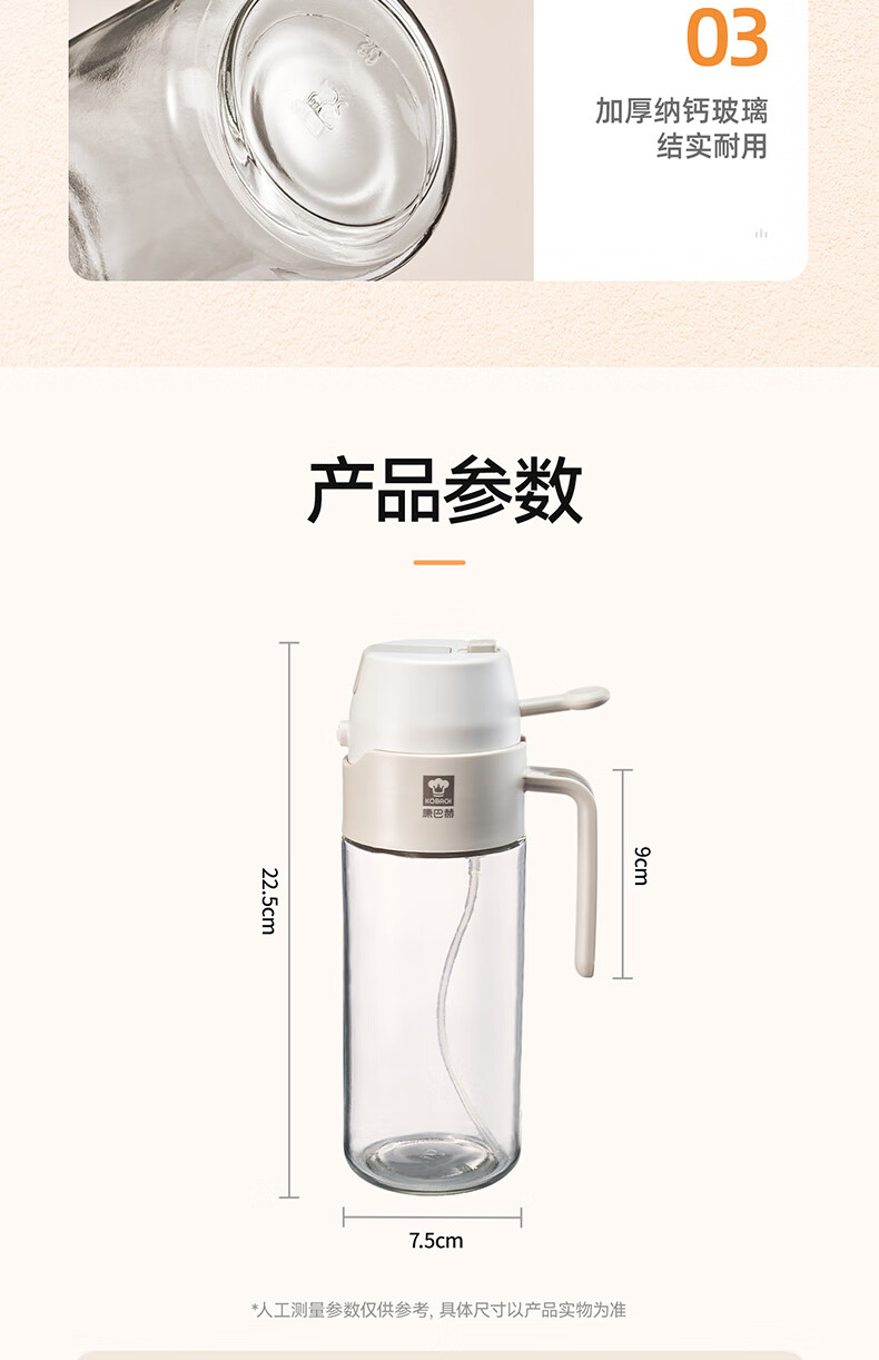 • 商品名称:康巴赫喷油壶家用厨房不挂油喷倒两用防漏油罐玻璃喷雾油壶调料瓶550ML KH-NZX01/个