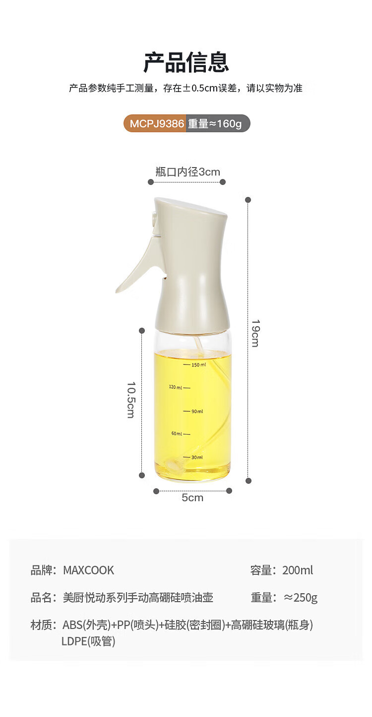 • 商品名称:美厨(maxcook)喷油壶 高硼硅喷油瓶橄榄油控油壶 食用油喷壶雾化喷雾瓶MCPJ9386 喷油壶高硼硅玻璃喷油壶/个