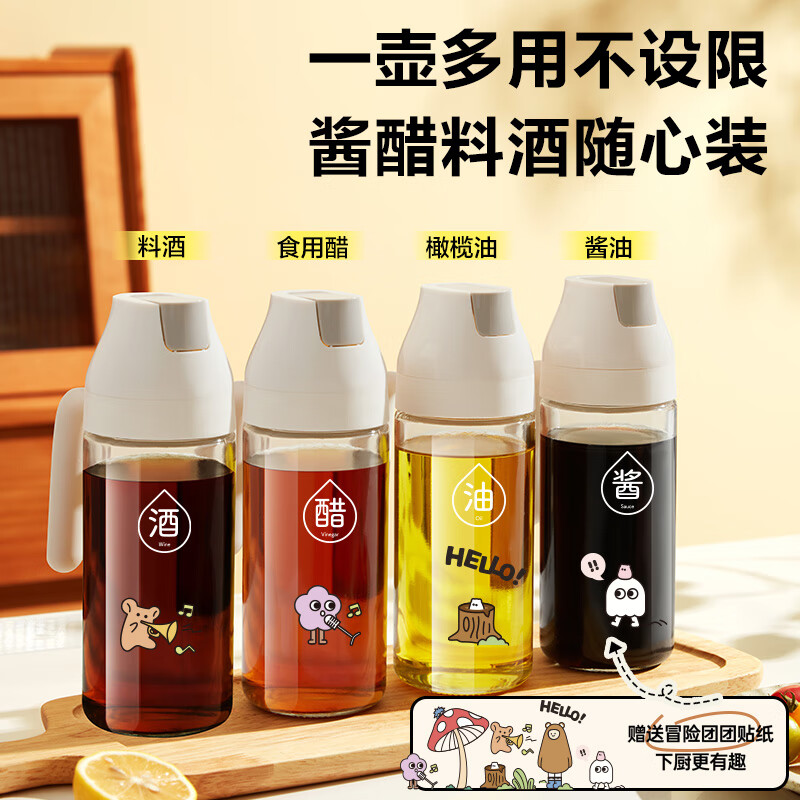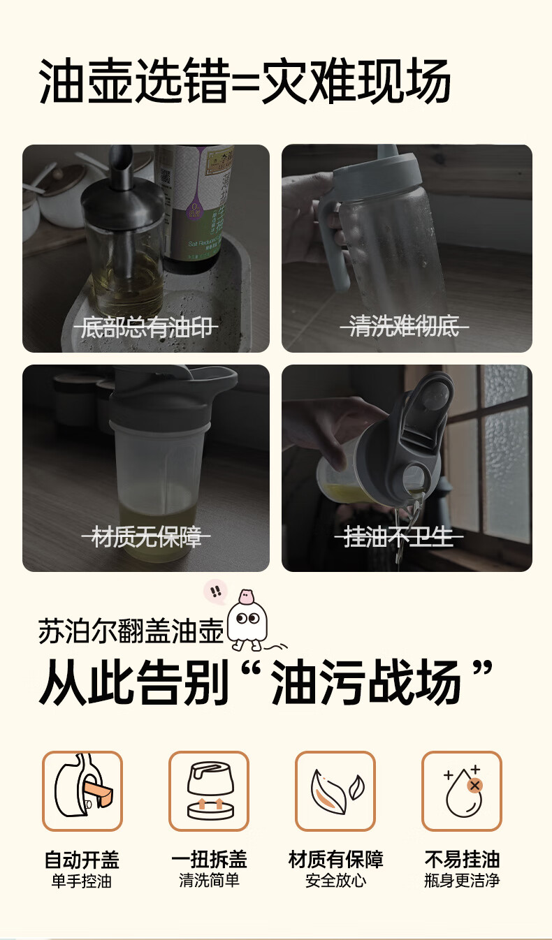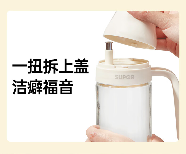 商品名称: 苏泊尔(SUPOR)易拆卸玻璃油壶油罐醋瓶酱油瓶自动翻盖香油壶550mL KGF55DV10 油壶/个