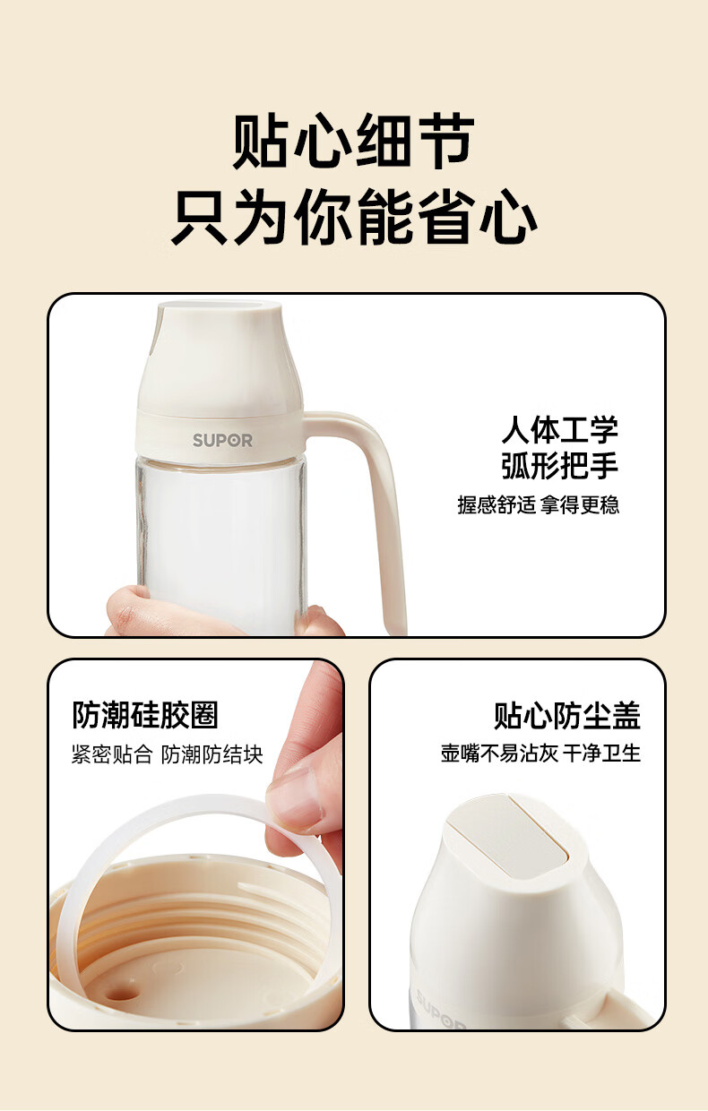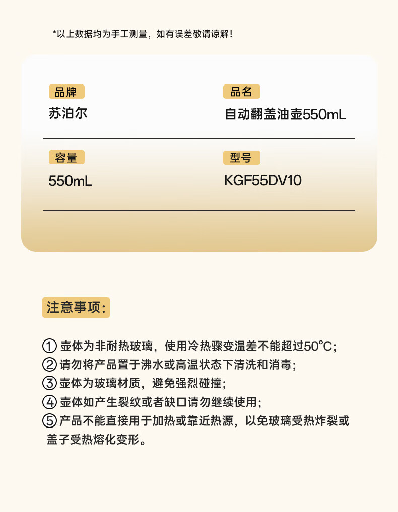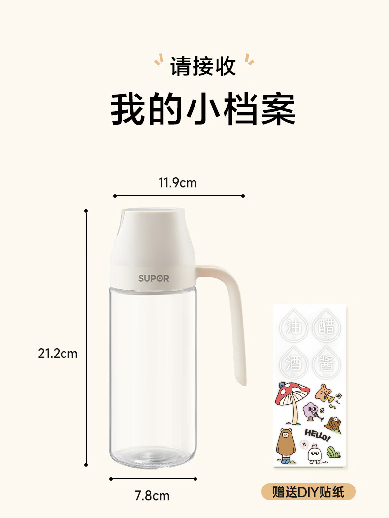 • 商品名称:苏泊尔(SUPOR)易拆卸玻璃油壶油罐醋瓶酱油瓶自动翻盖香油壶550mL KGF55DV10 油壶/个