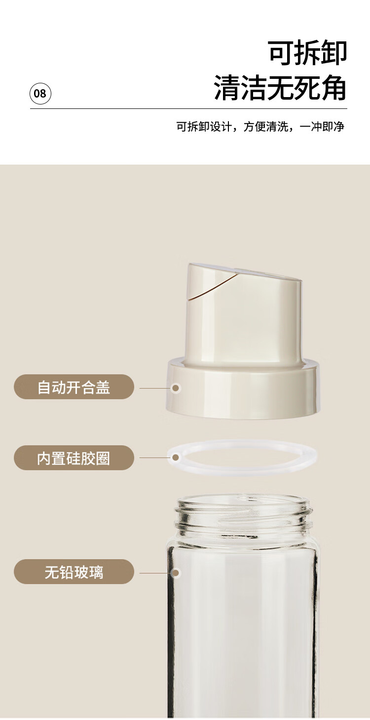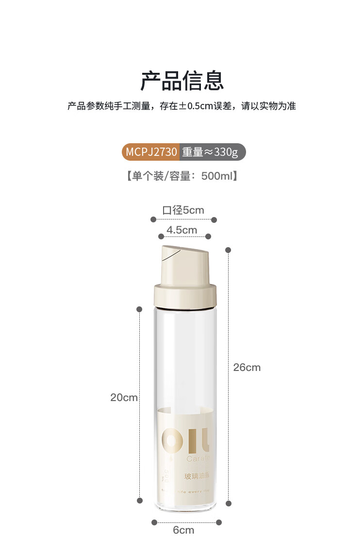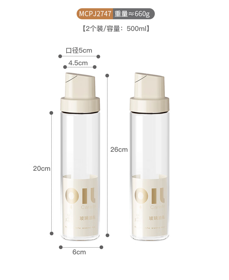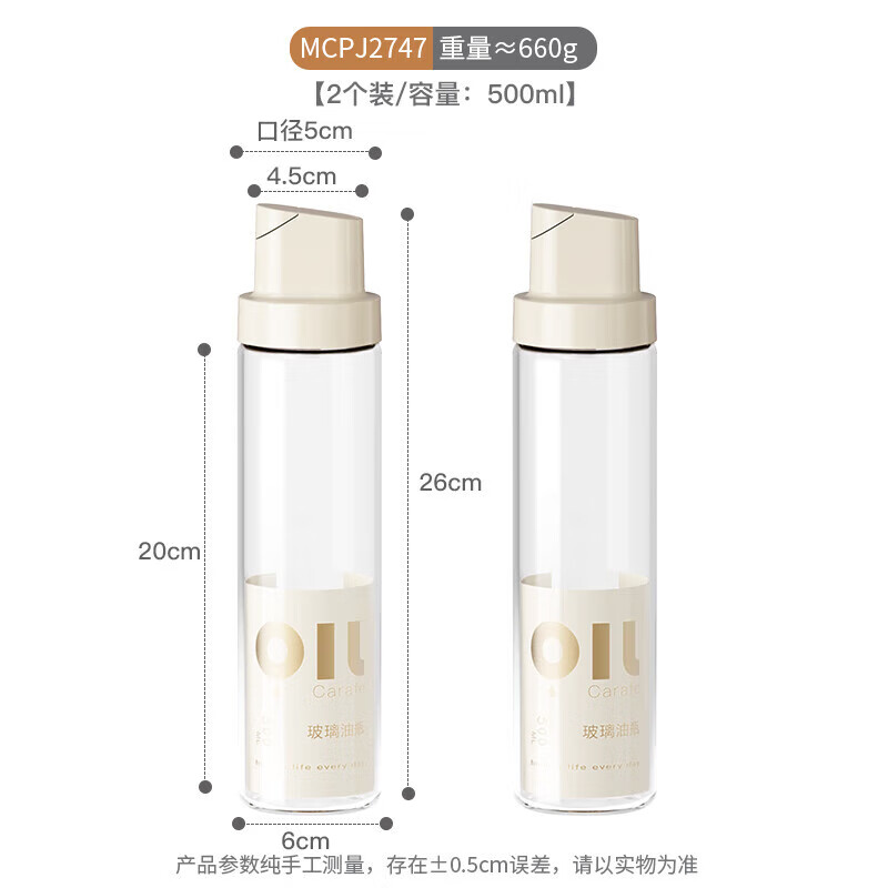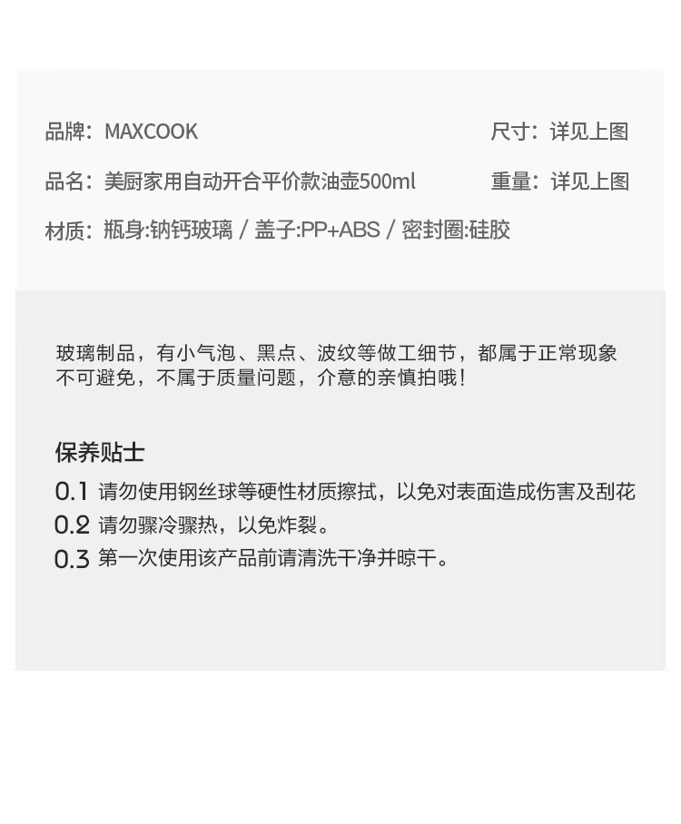 • 商品名称:美厨(maxcook)自动开合油壶 玻璃油壶500ML 调料瓶酱油醋瓶 2只装MCPJ2747 玻璃油壶油罐/个
