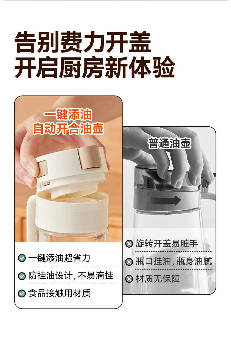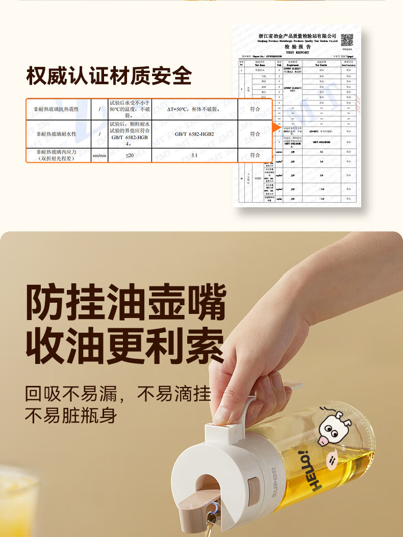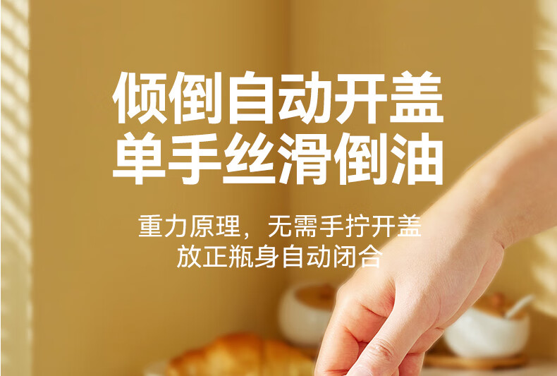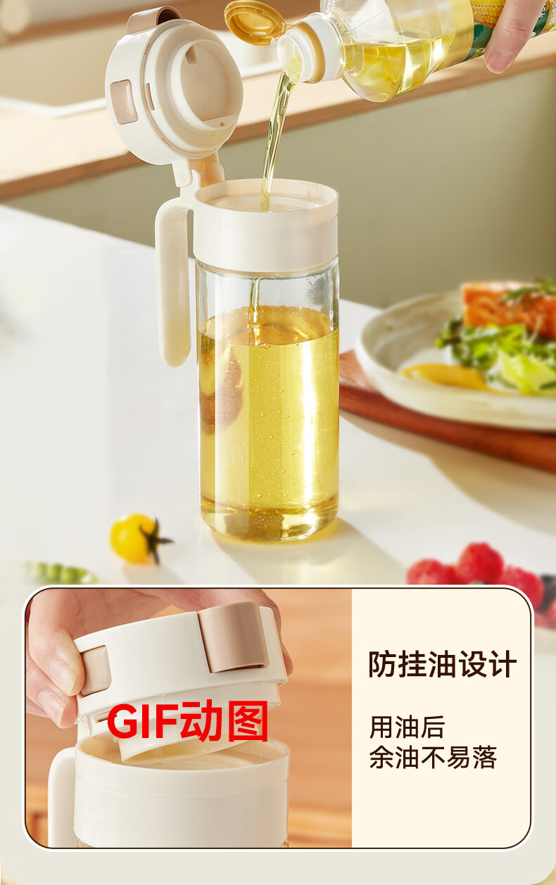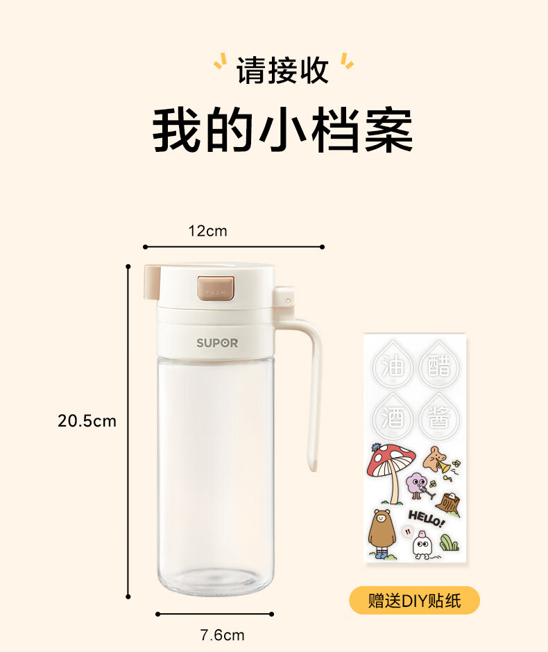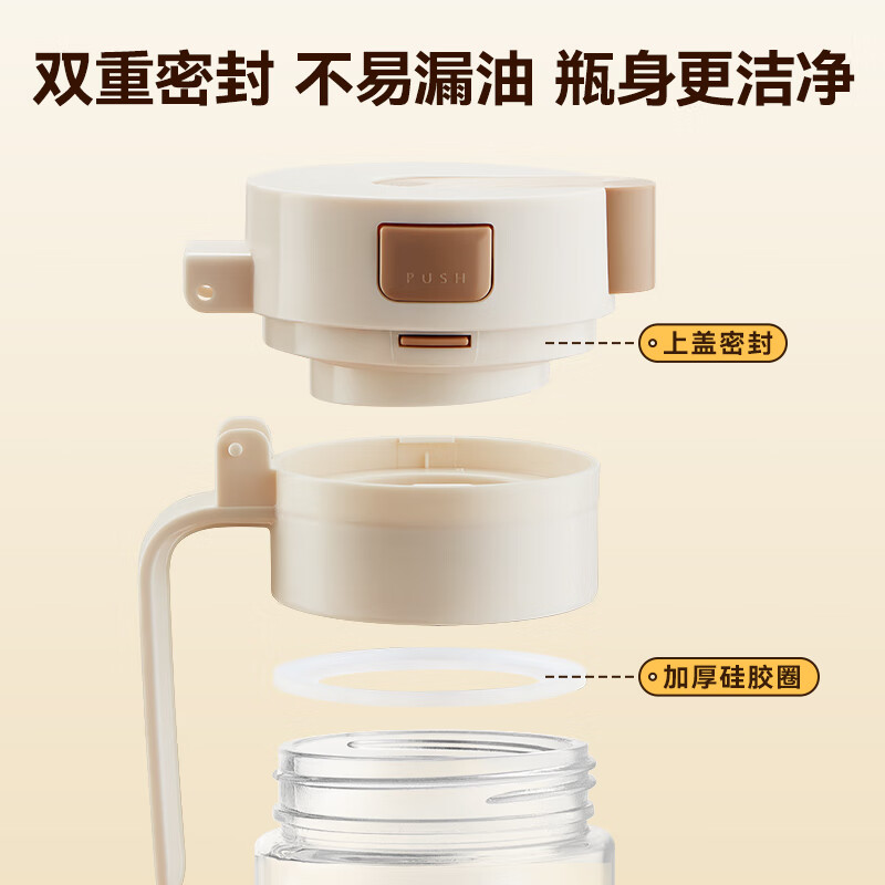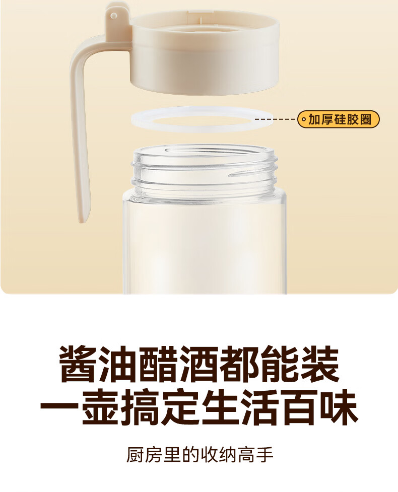 • 商品名称:苏泊尔(SUPOR)玻璃油壶不挂油 酱油瓶防漏嘴油罐壶醋瓶醋壶调料瓶自动翻盖500ml KGF55DU10/个