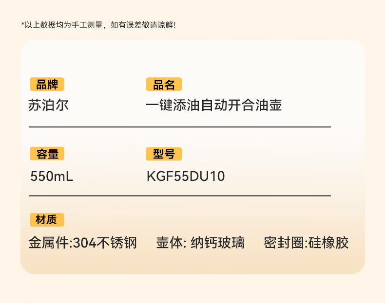 商品名称: 苏泊尔(SUPOR)玻璃油壶不挂油 酱油瓶防漏嘴油罐壶醋瓶醋壶调料瓶自动翻盖500ml KGF55DU10/个