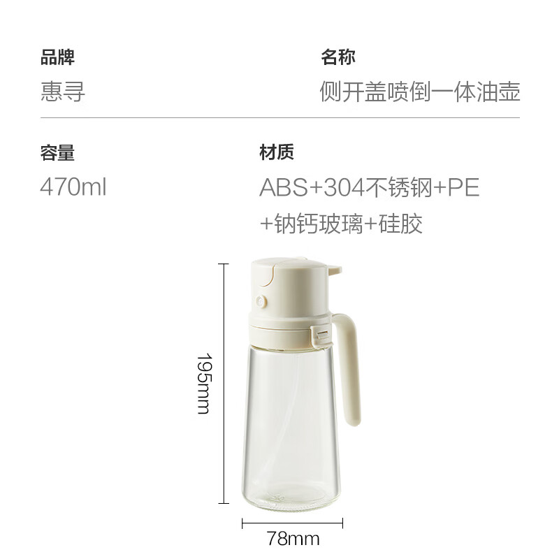 商品名称: 惠寻 喷油壶 喷雾倒油喷油一体玻璃油罐调料酱油瓶不挂油470ml 喷倒一体油壶/个