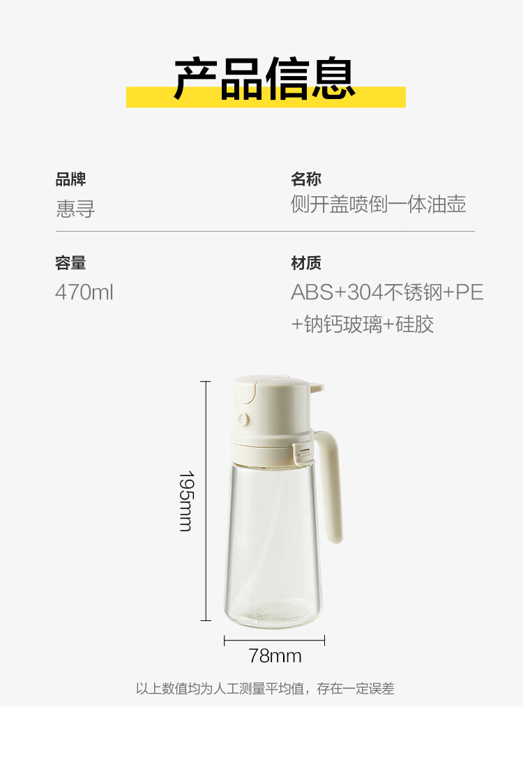 • 商品名称:惠寻 喷油壶 喷雾倒油喷油一体玻璃油罐调料酱油瓶不挂油470ml 喷倒一体油壶/个