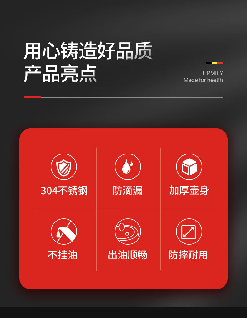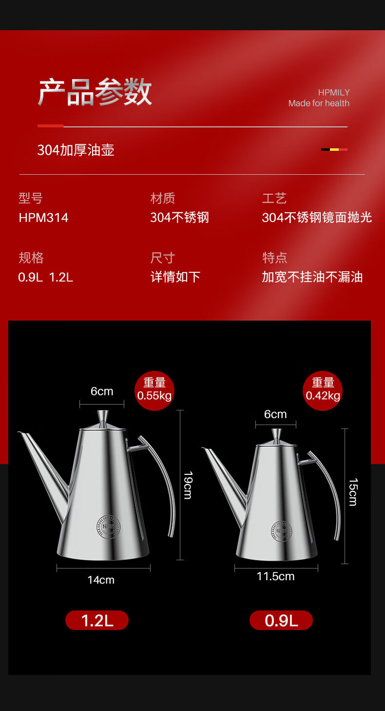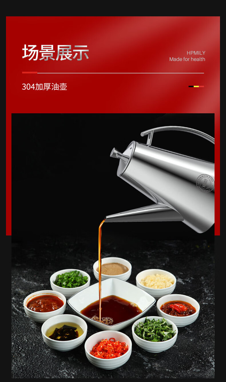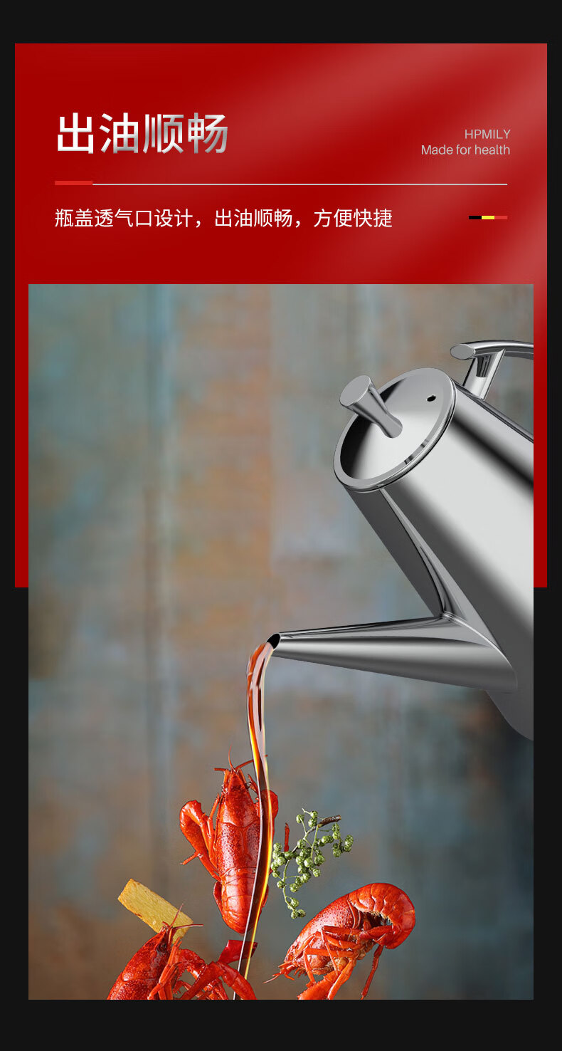 • 商品名称:助家乐(HPMILY)油壶304不锈钢油瓶家用不挂油宽口900ml防漏调料瓶加厚厨房调味 304不锈钢油瓶家用/个