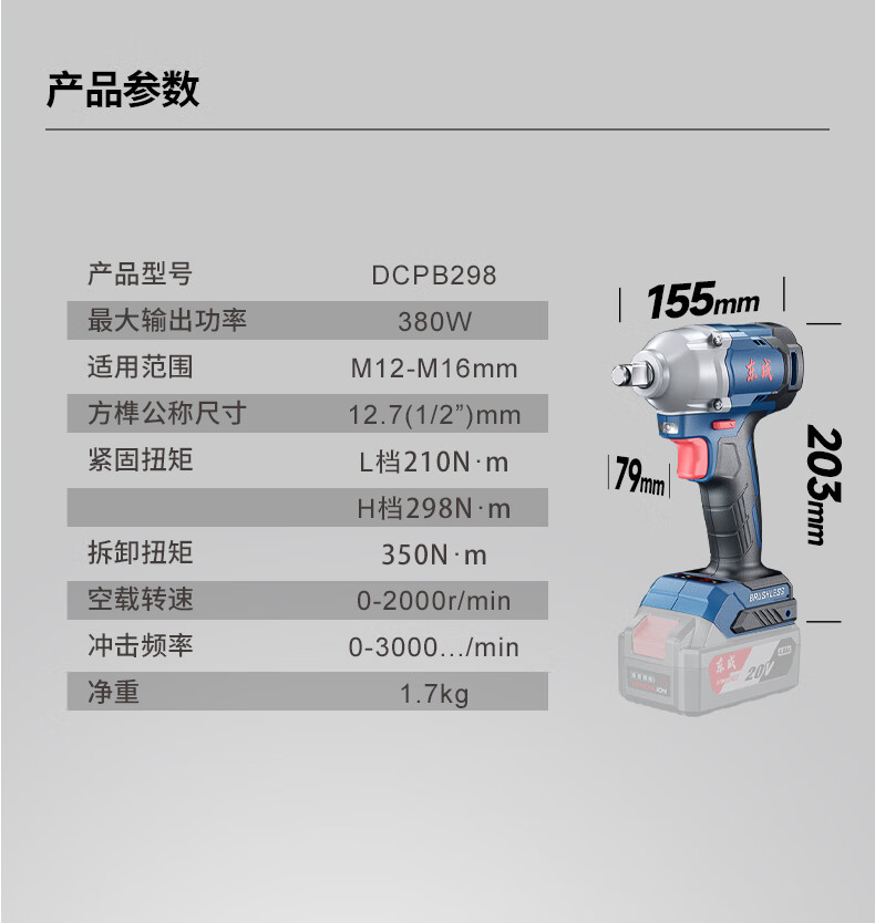 • 商品名称:东成20V锂电无刷电动扳手DCPB298D汽修冲击锂电扳手充电式套筒风炮 DCPB298D/台