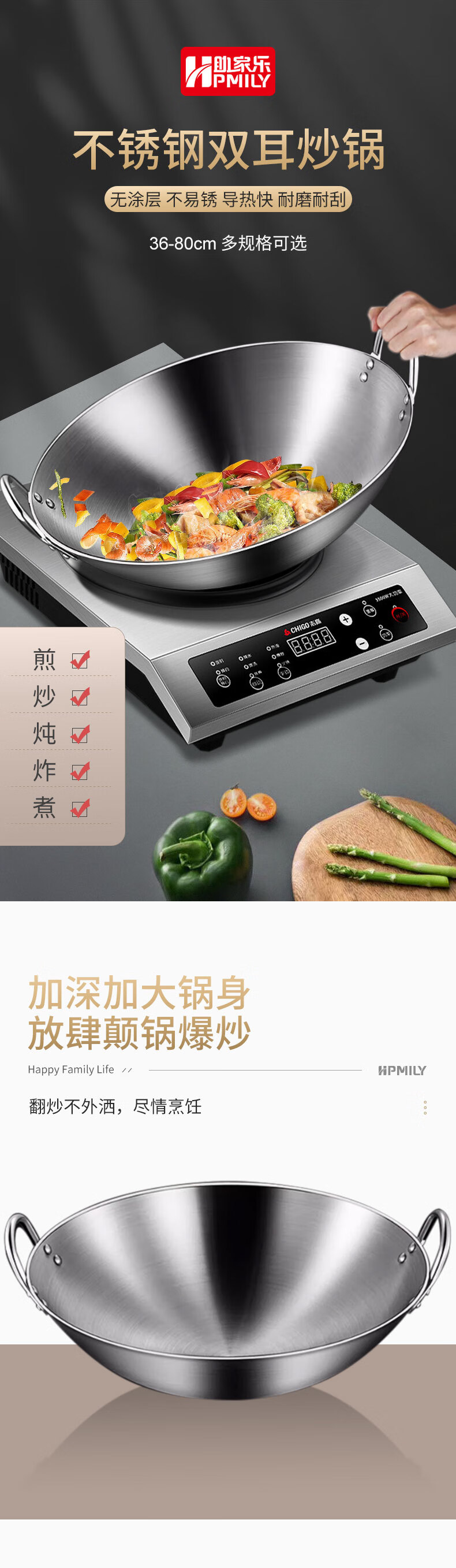 • 商品名称:助家乐(HPMILY)凹面电磁炉专用锅不锈钢双耳炒锅凹型炒菜锅凹式电灶锅带磁60cm 凹面电磁炉不锈钢双耳炒锅/个