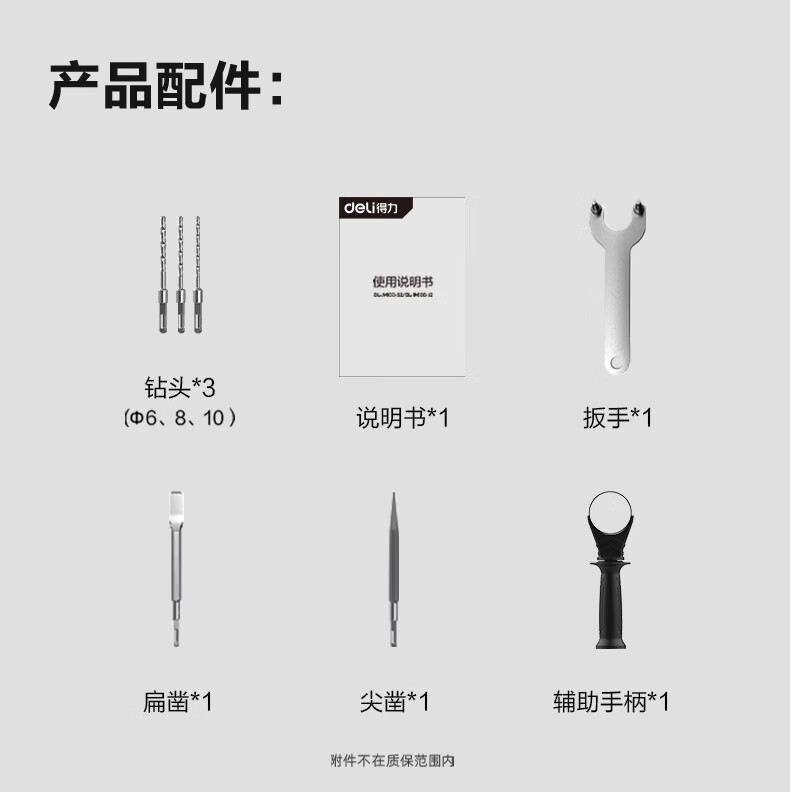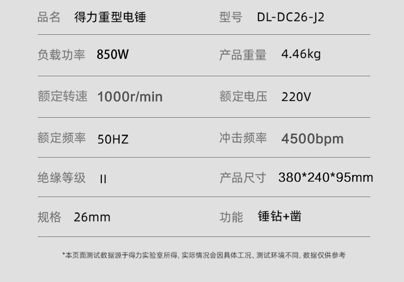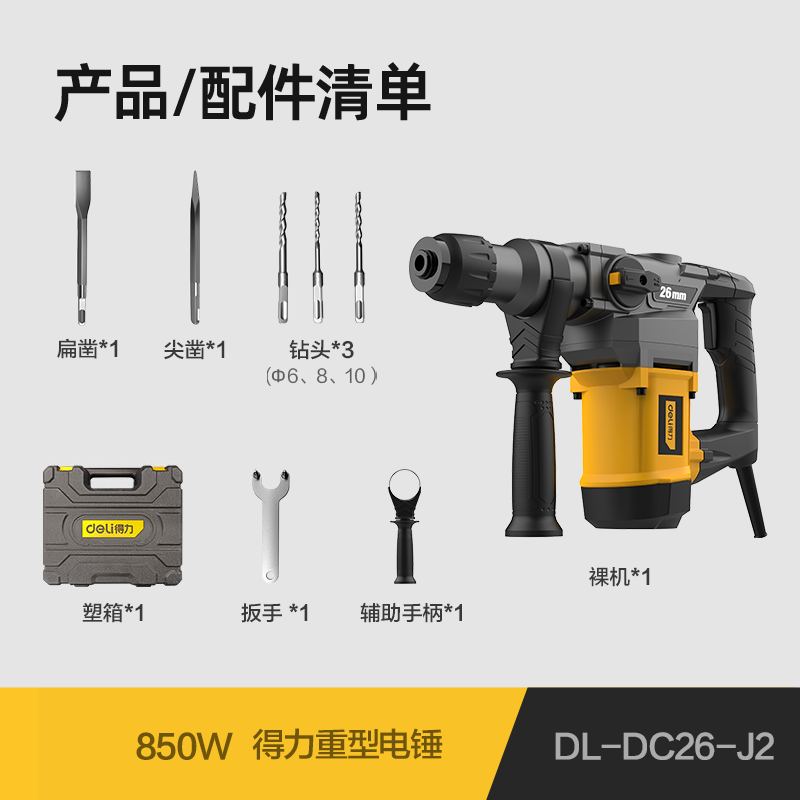 包装清单: 得力工具DL-DC26-J2电锤_850W/220V_26mm_锤钻+凿(台)