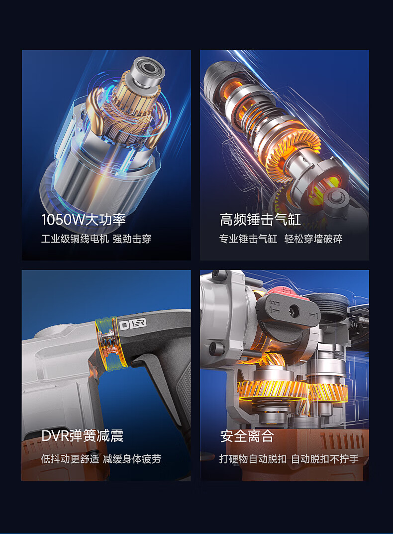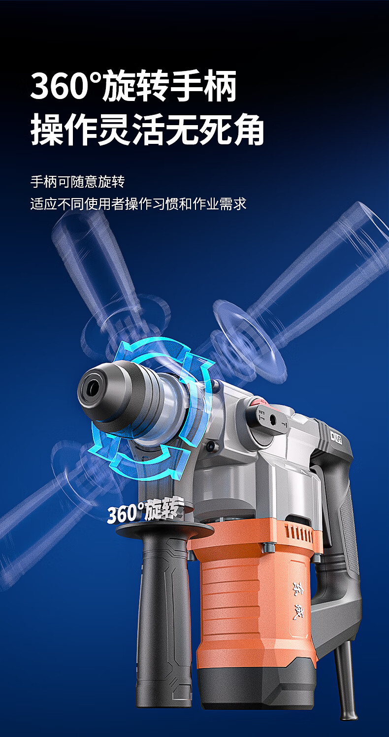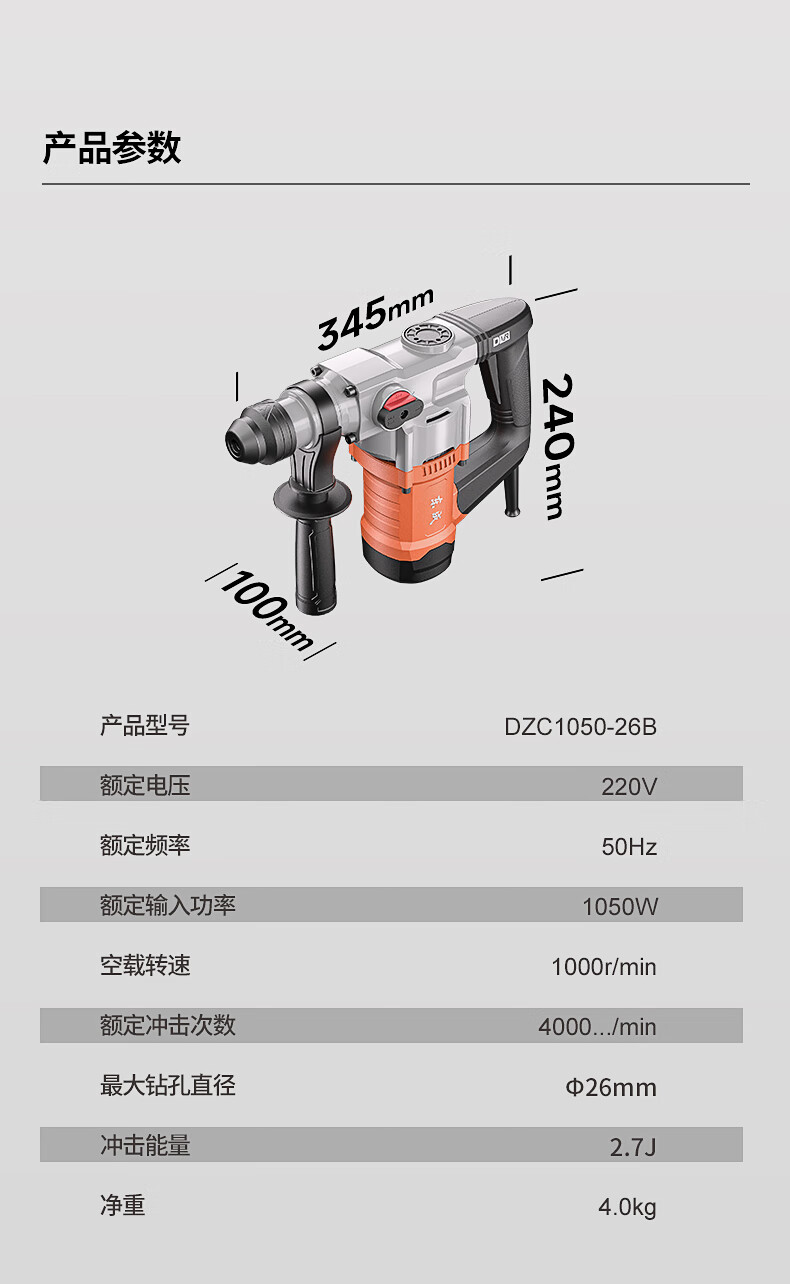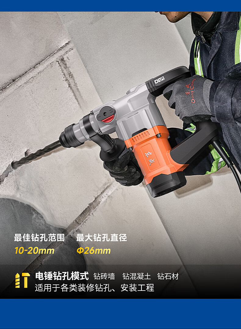 商品名称: 东成1050W电锤电镐两用DZC1050-26BT冲击钻混凝土电钻自带安全离合 DZC1050-26BT/台