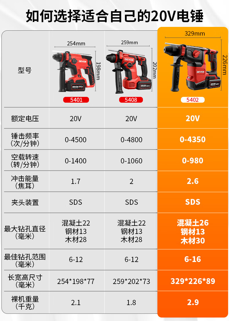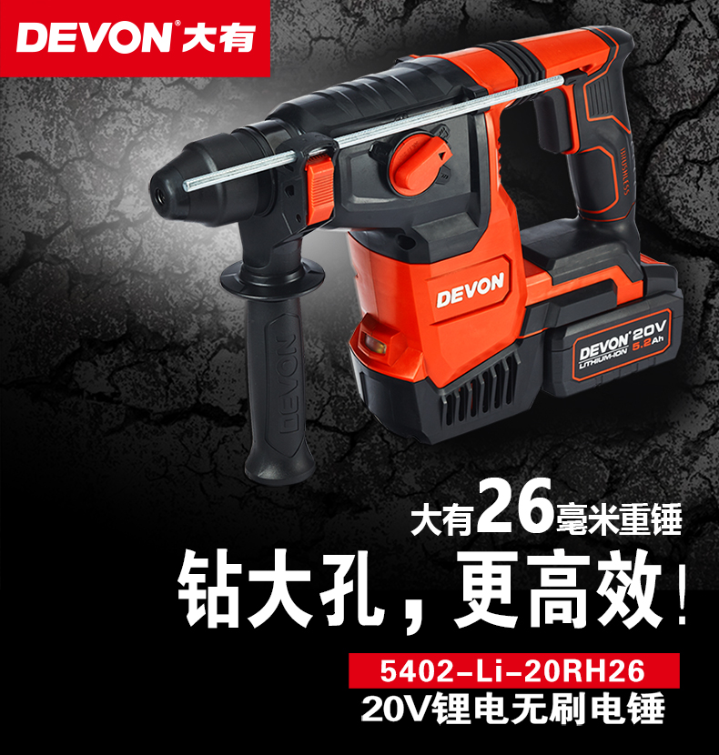 商品名称: 大有(Devon)20V无刷充电电锤毫米无线无感重锤公路混凝土电镐 5402(裸机) 5402/台