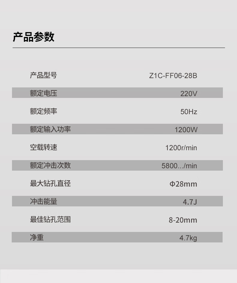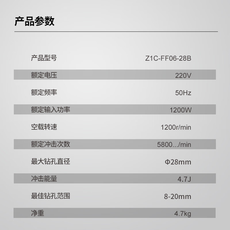 商品名称: 东成1200W重载植筋两用电锤带安全离合减震混凝土打孔 Z1C-FF06-28B Z1C-FF06-28B/台