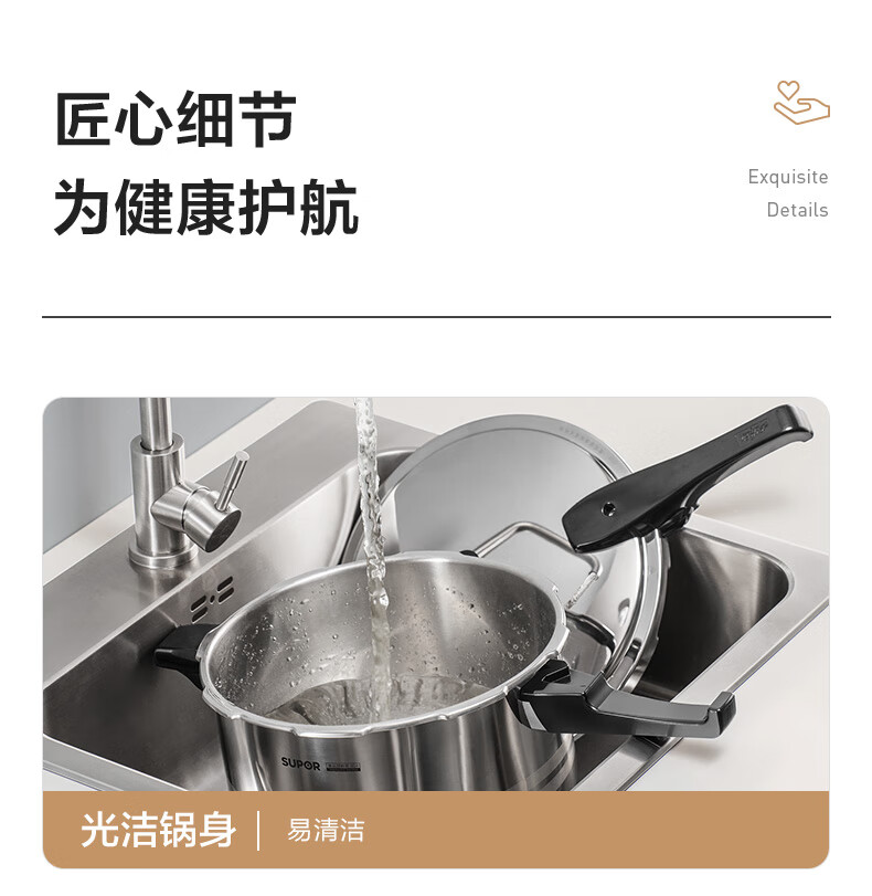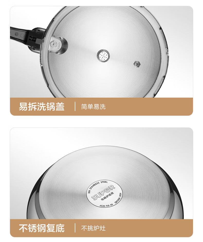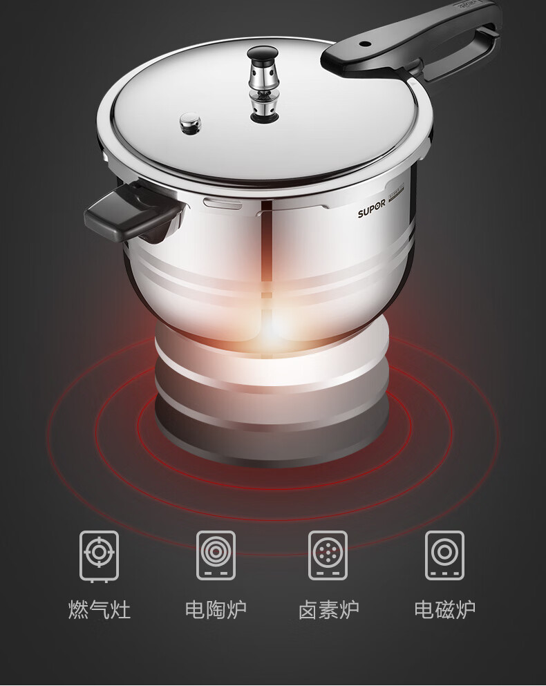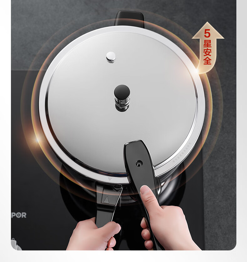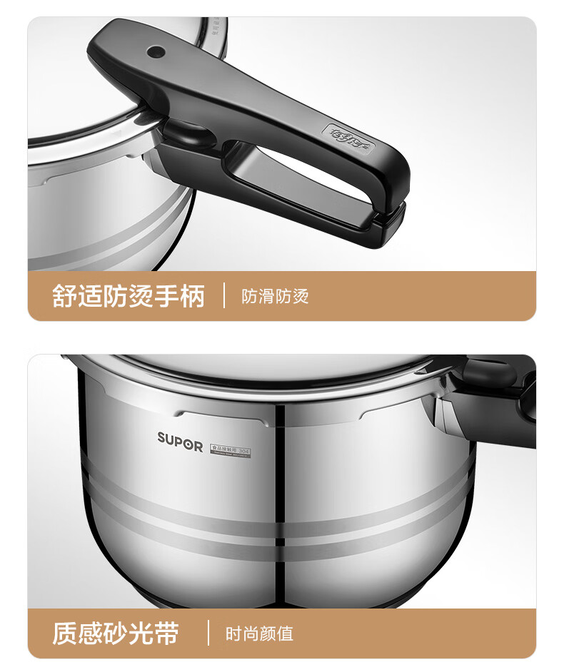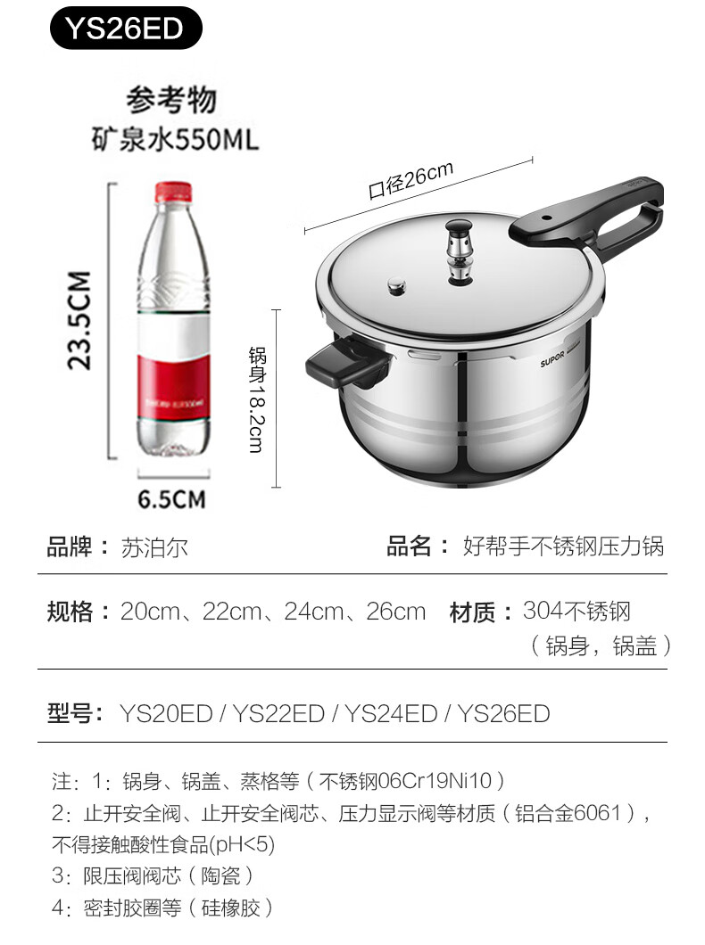 • 商品名称:苏泊尔(SUPOR)304不锈钢5.2L压力锅22cm【2-4人适用】快煮防爆高压锅电磁炉通用 22cm好帮手不锈钢压力锅YS22ED/个