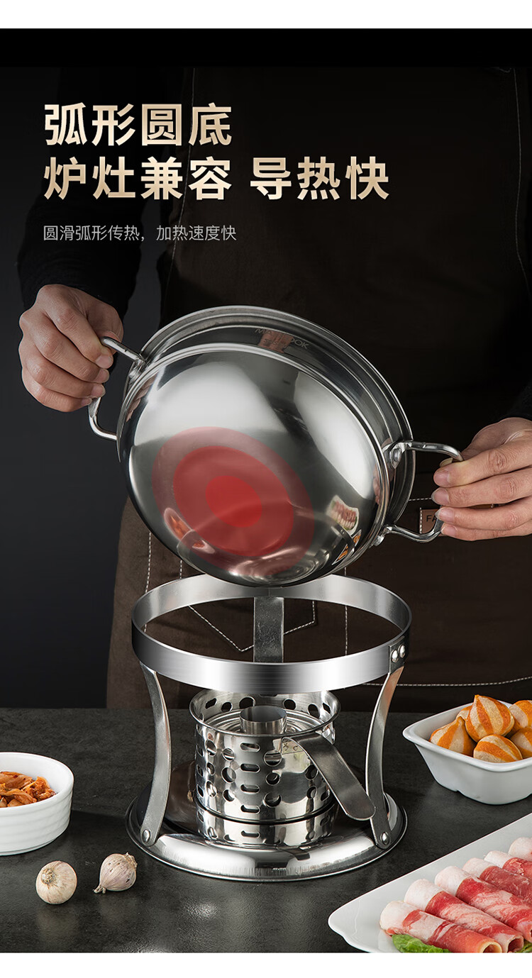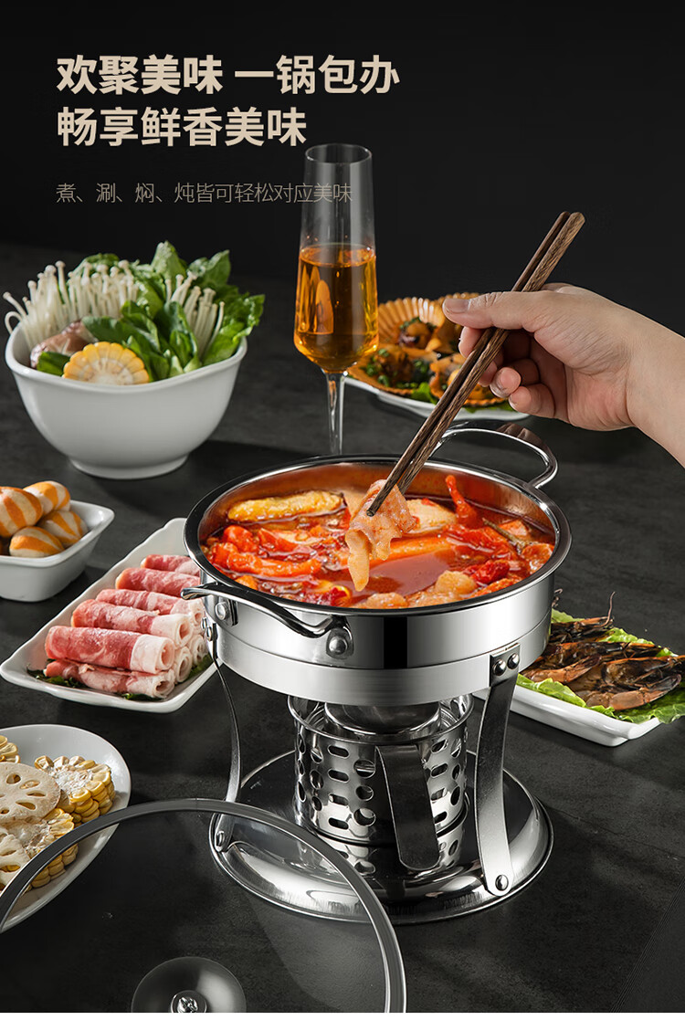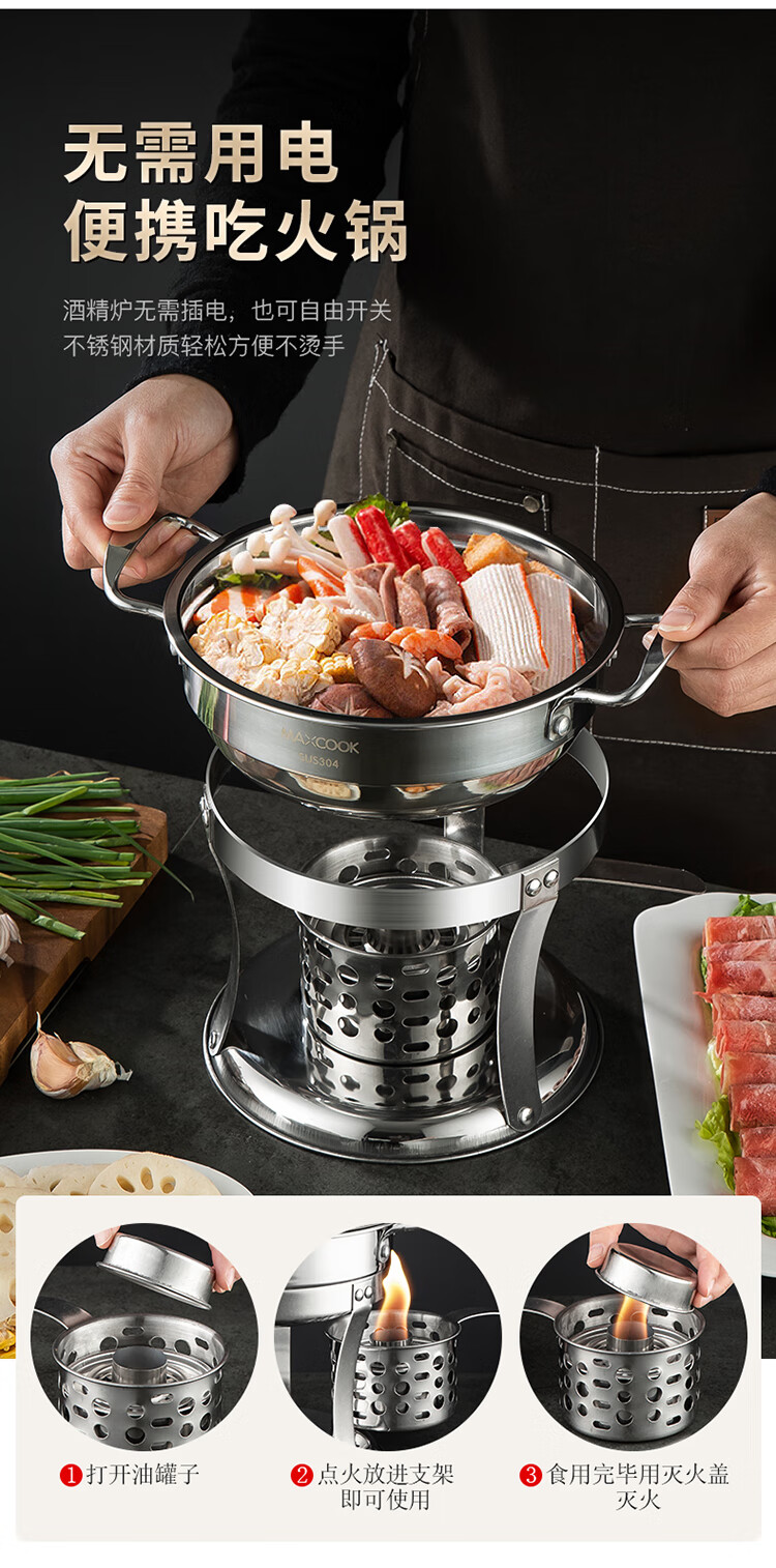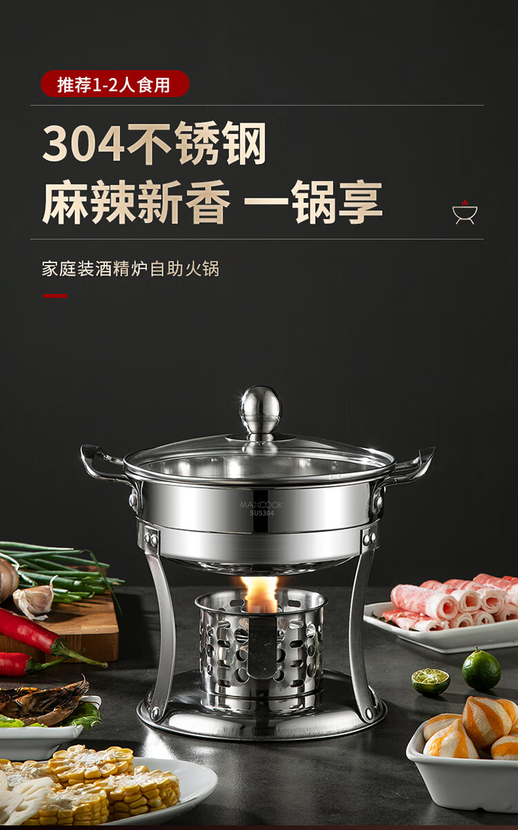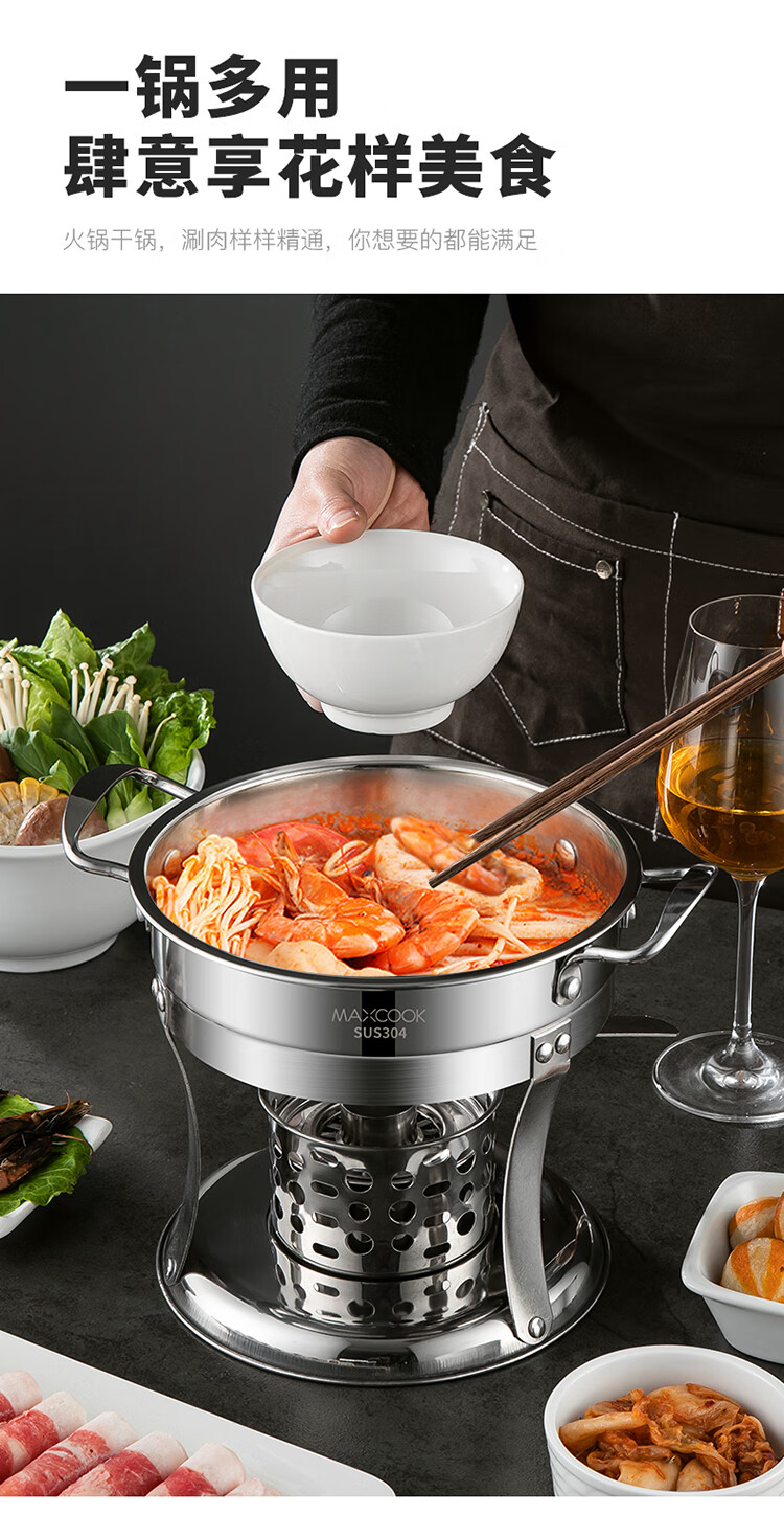 美厨(maxcook)304不锈钢火锅 酒精炉小火锅干锅固液体通用 配火锅勺16cm MCT762 304不锈钢火锅/套