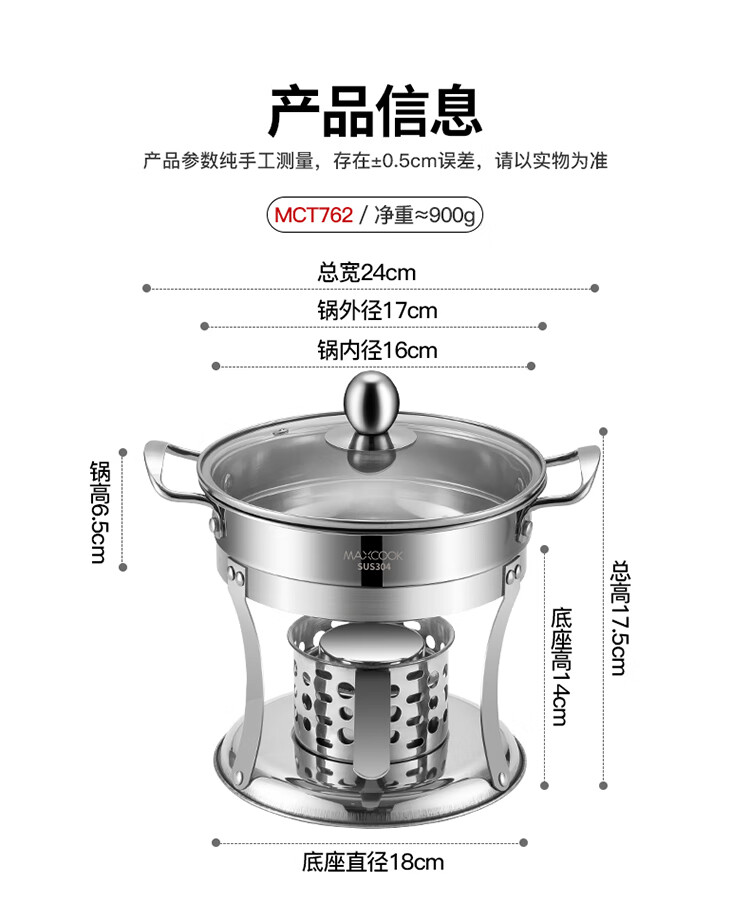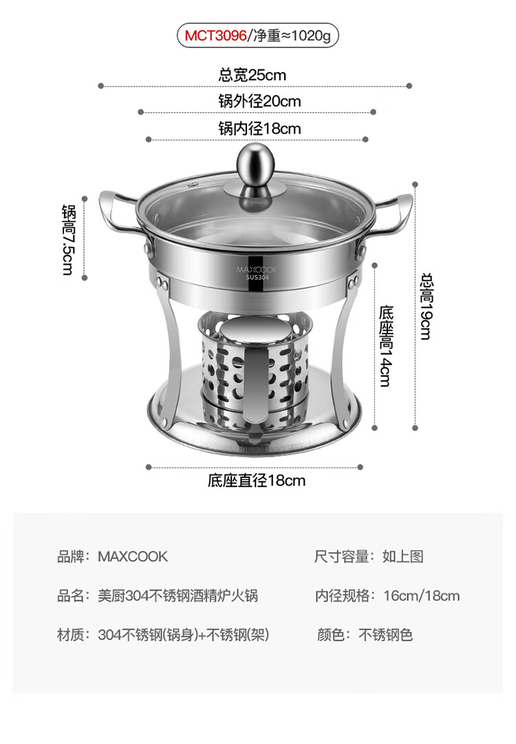 商品名称: 美厨(maxcook)304不锈钢火锅 酒精炉小火锅干锅固液体通用 配火锅勺16cm MCT762 304不锈钢火锅/套
