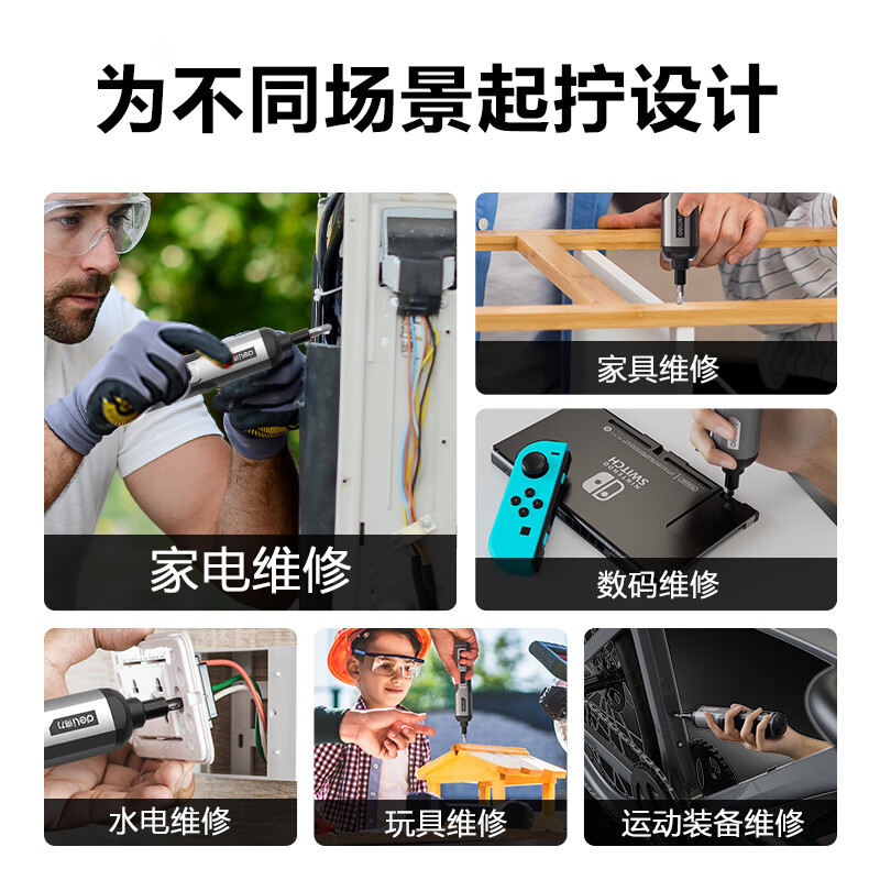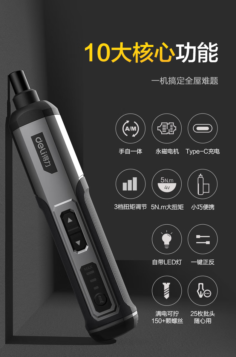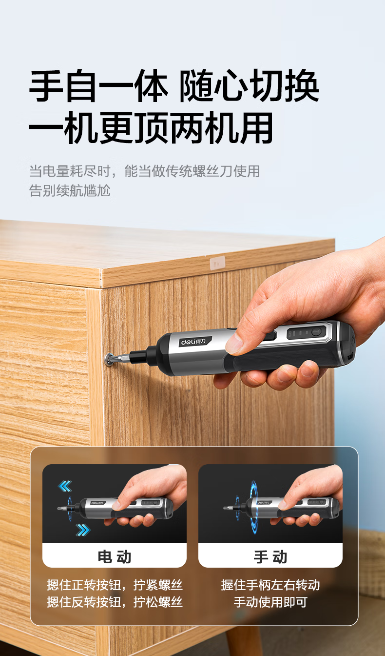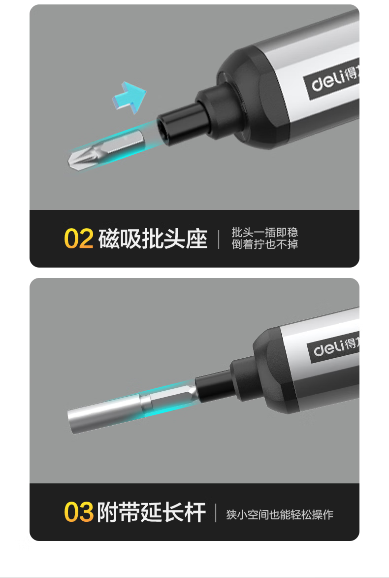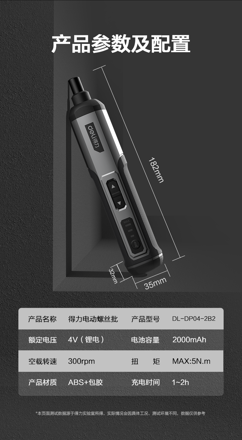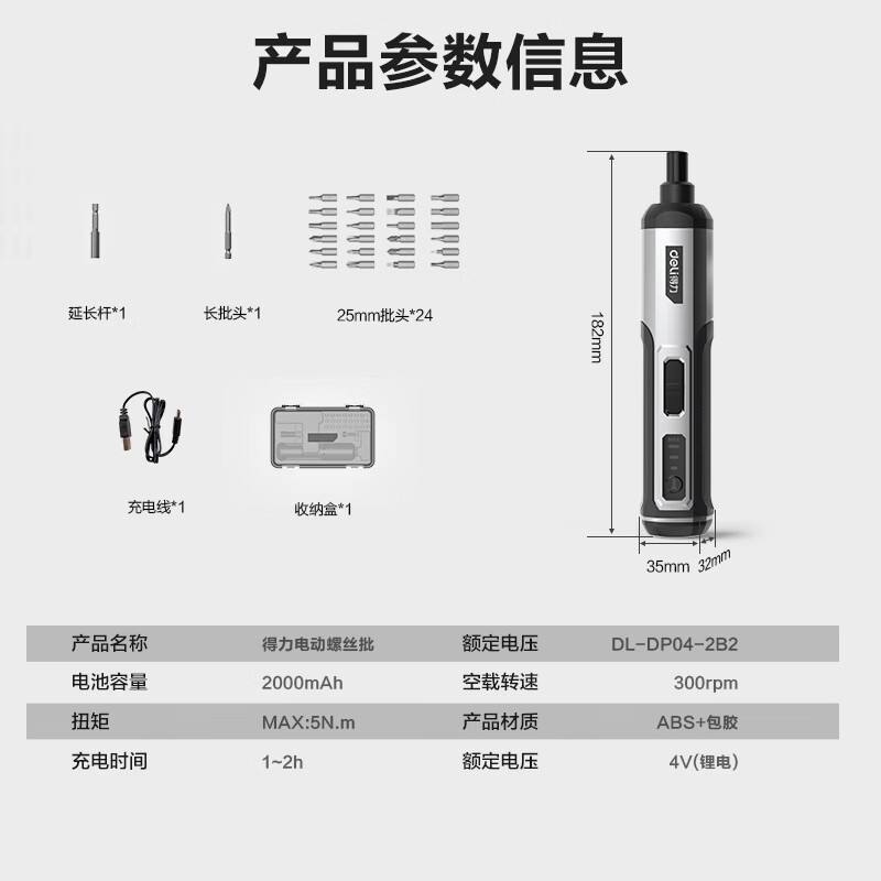 • 商品名称:得力电动螺丝刀充电式家用小型迷你电动螺丝起子带25批头套装 DL-DP04-2B2/套