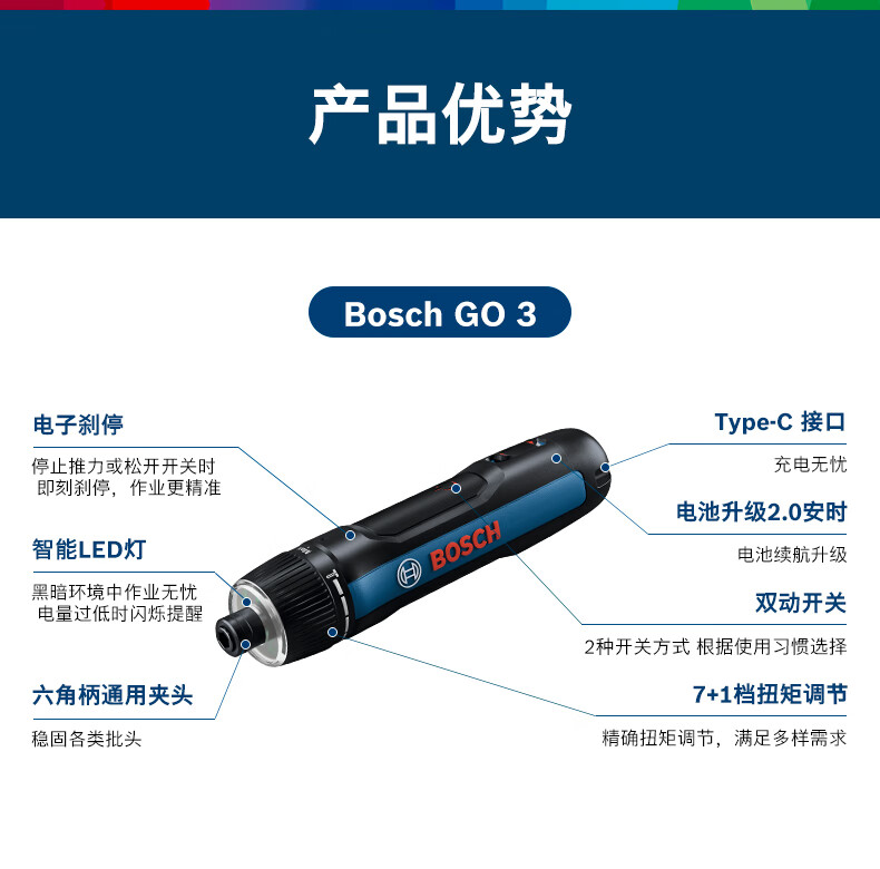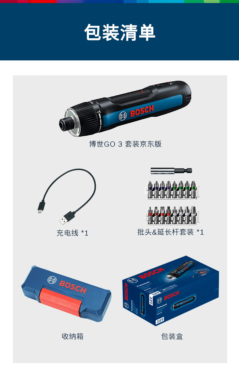• 商品名称:博世(BOSCH)电动螺丝刀/起子机家用安装数码维修GO3 17件批头套装磁吸延长杆 BOSCH GO 3/套