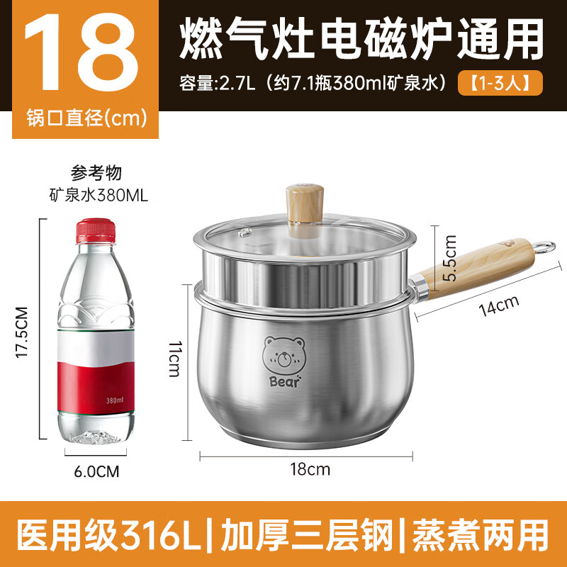 双枪(Suncha)奶锅316L不锈钢婴儿宝宝辅食小奶锅汤锅雪平蒸锅加厚带蒸笼 18cm DZ34512/片