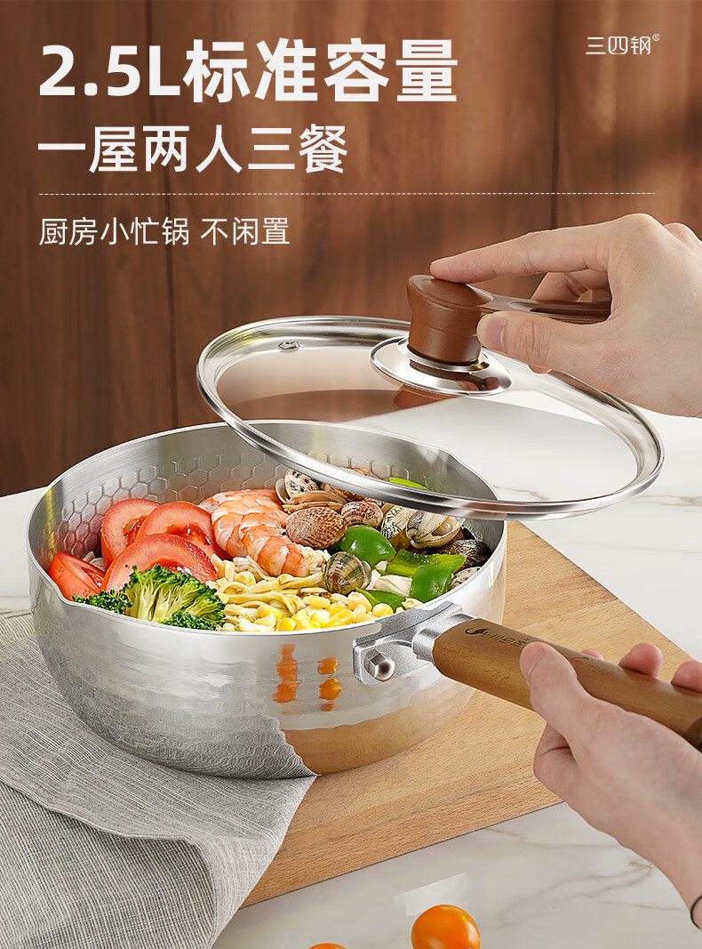 三四钢雪平锅内层316L不锈钢奶锅辅食小汤锅泡面煮锅20cm食品级一体成型 38121 御厨316L雪平锅:20cm带蒸笼/个