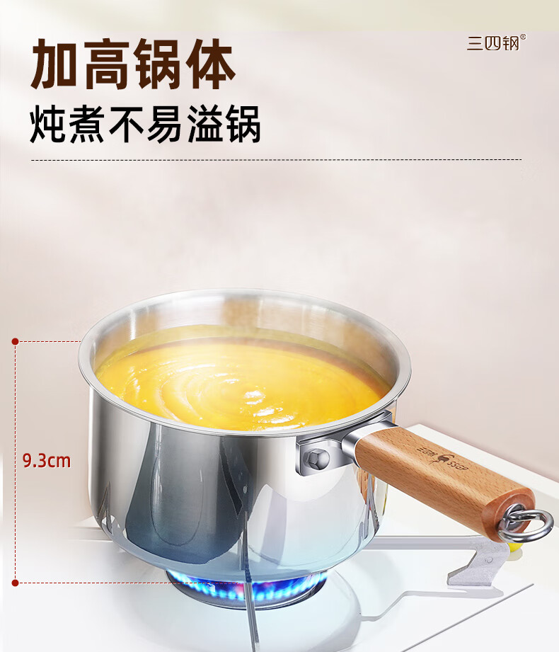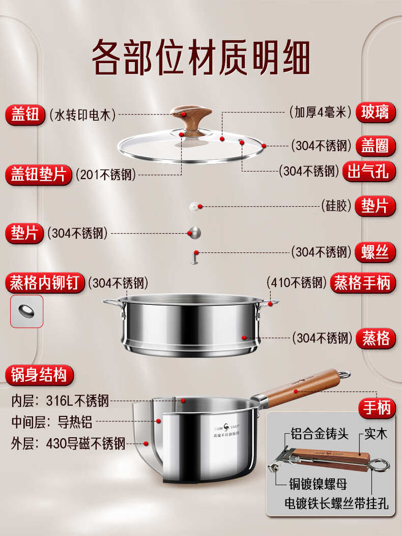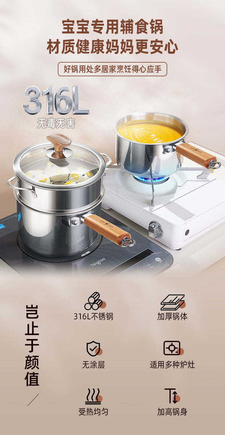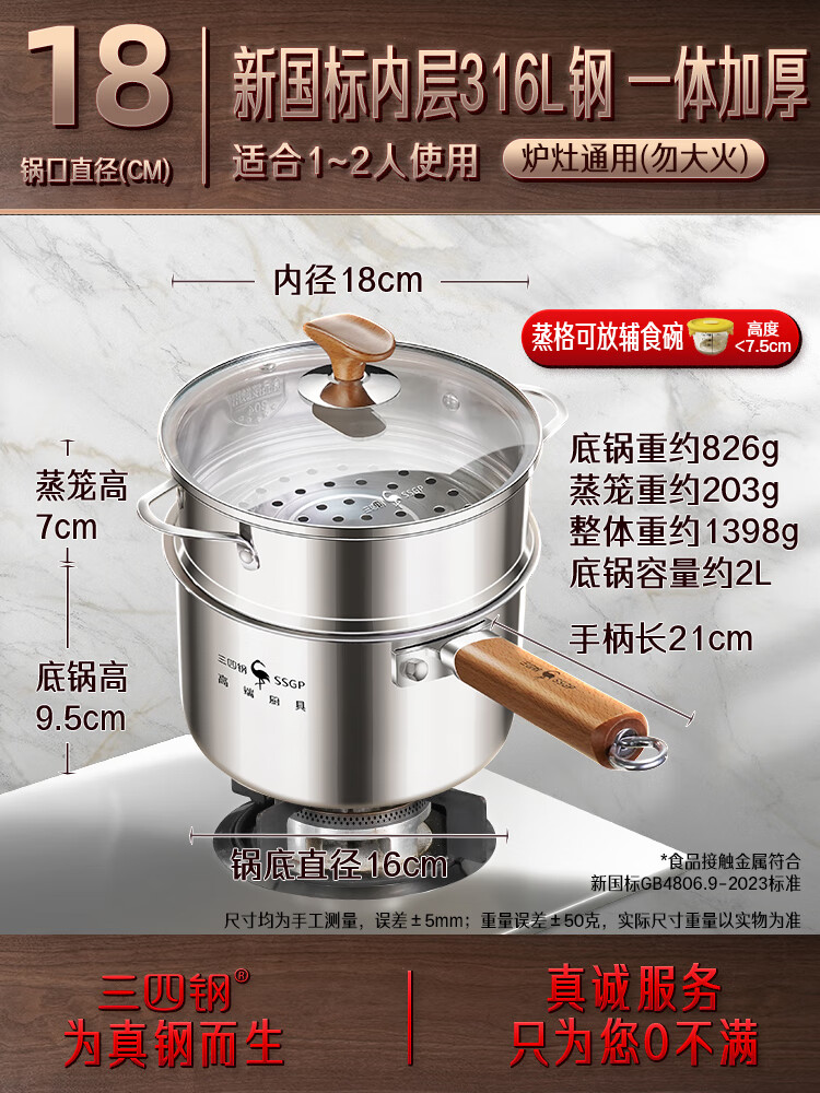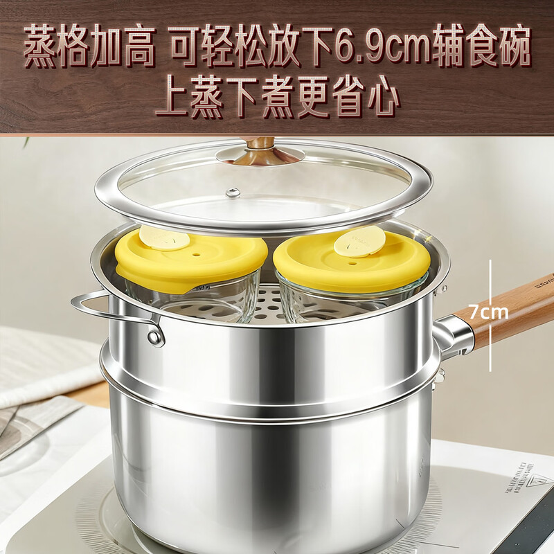 商品名称: 三四钢®奶锅辅食锅316不锈钢小奶锅食品级一体成型婴儿专用宝宝蒸煮锅 28908 柏林经典316L奶锅:18cm加厚款带蒸格/个
